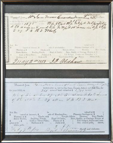 Two receipts dated 1853 signed D. J. Brown, Sheriff. Shows payments of taxes in which fees were charged for dueling pistols and Bowie knives, and just about everything else. No location listed, both in good condition. From the William R. Orbelo Collection. Est: $150 - $300