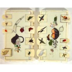 Two rectangular ivory Shibayama markers inlaid with mother-of-pearl, metal, enamel, etc, and decorated with birds and bowls of fruit, paper label to back, 10cm in length