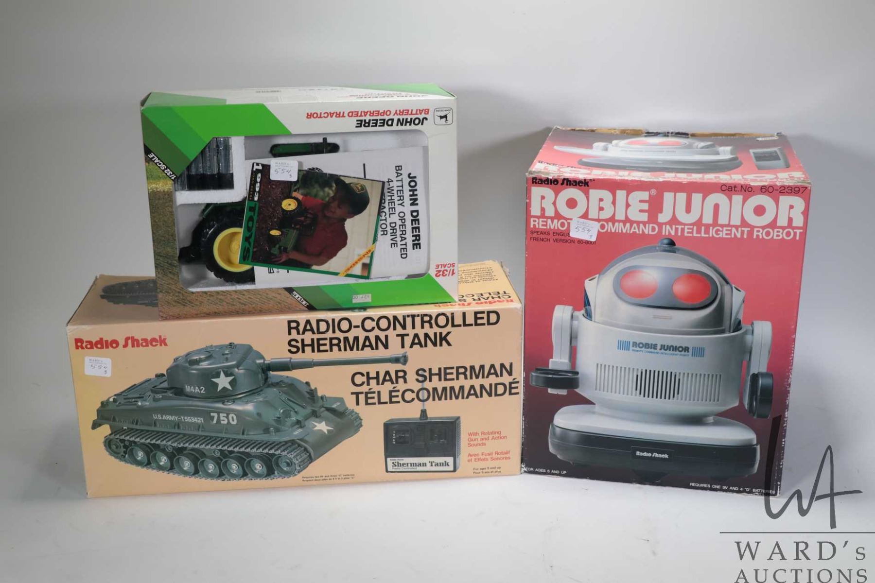 Two remote control toys including vintage Robie Junior robot and Radio Shack Sherman tank. Plus a battery operated John Deere 4WD tractor