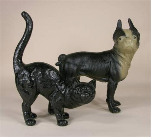 Two reproduction cast iron door stops including Boston Terrier and cat, both 10 1/2 inches tall. Good Cond.
