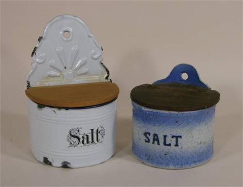 Two salt boxes, one made in Germany by Weburg, porcelain w.minor chips and one crockery.