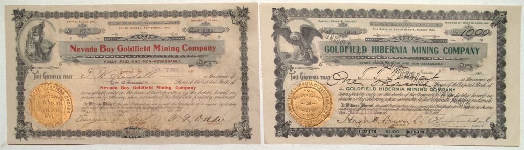 1) Goldfield Hibernia Mining Company. #668 for 1,000 shares to T T Tennant in 1907. Signed by Hugh H. Brown as secretary. Brown was a San Francisco lawyer who moved to Goldfield and was deeply involved in Goldfield mining. He was made famous by his wife who wrote, "Lady in Boomtown." 2) Nevada Boy Goldfield Mining Company. Stock #875 for 1,000 shares to T. W. Kendall in 1907. Signed by Eugene E ? and T. L. Oddie. Kendall was the original owner of this property and an important mining man. Oddie would become a United States Senator and Governor from Nevada.