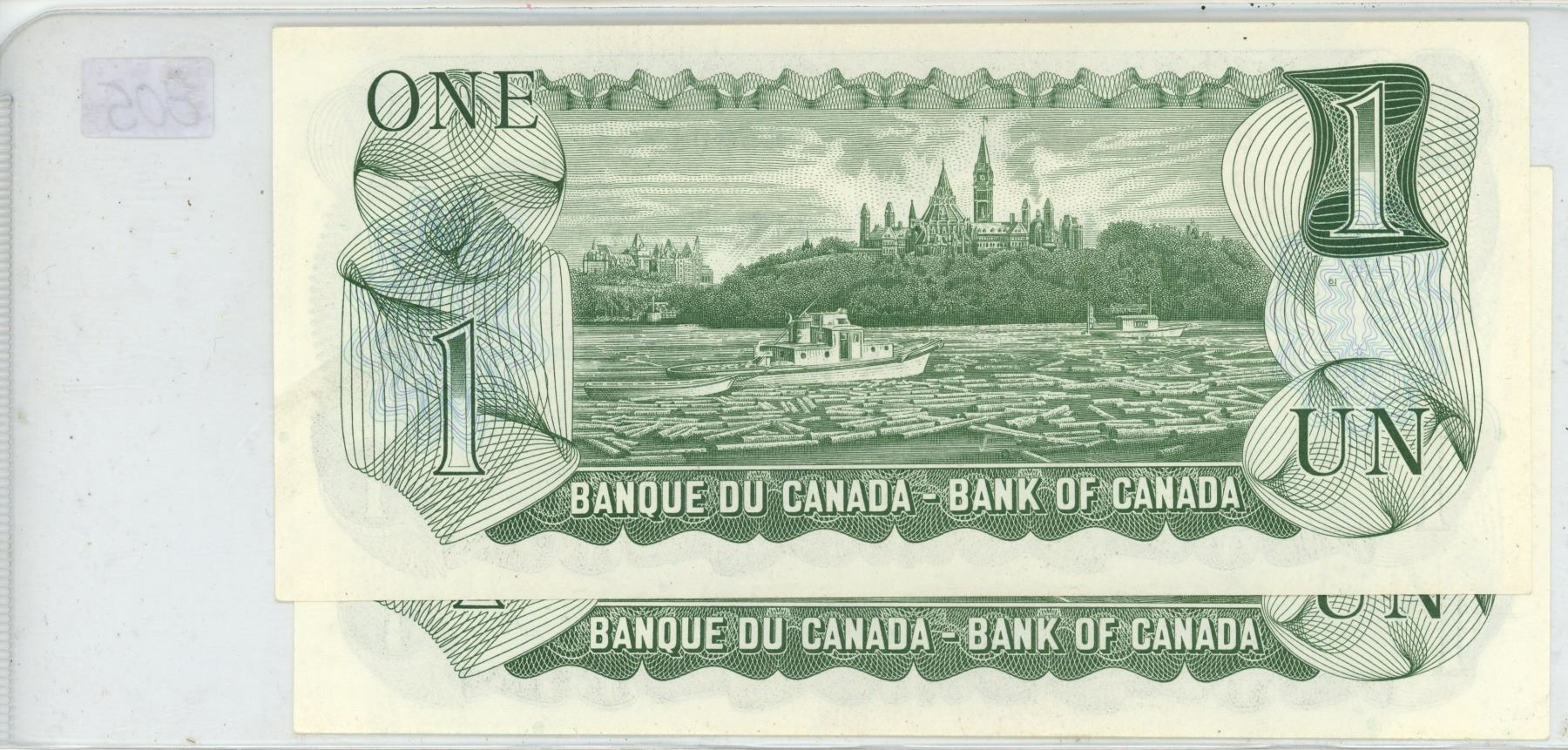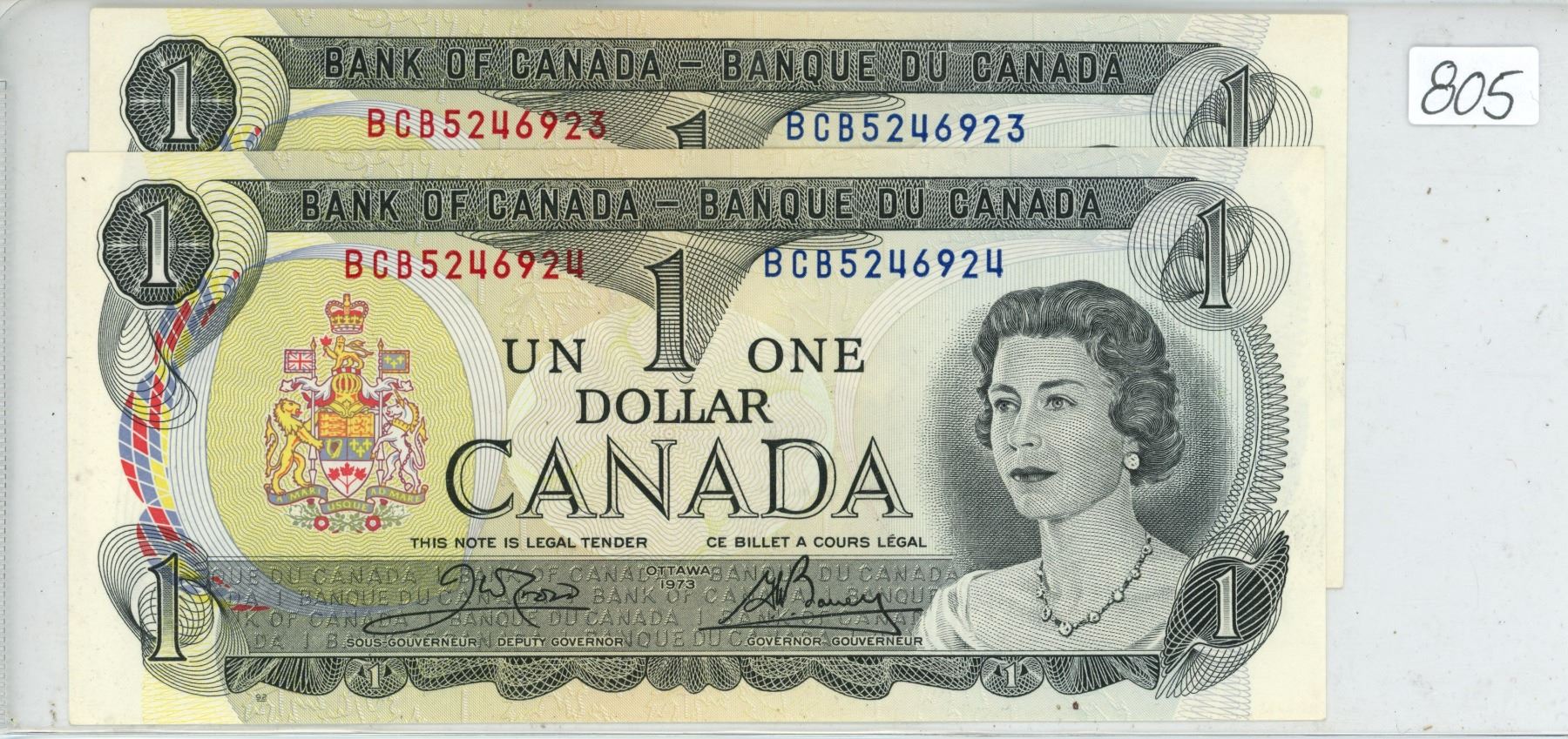 Two sequential serial no. 1973 Canada $1.00 One Dollar bills