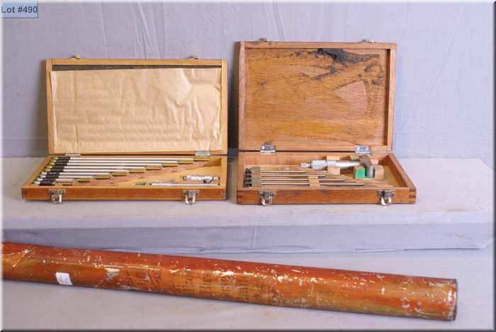Two sets of wooden boxed tools including bore micrometer and depth micrometer both by Mitutyo and a vintage fire extinguisher