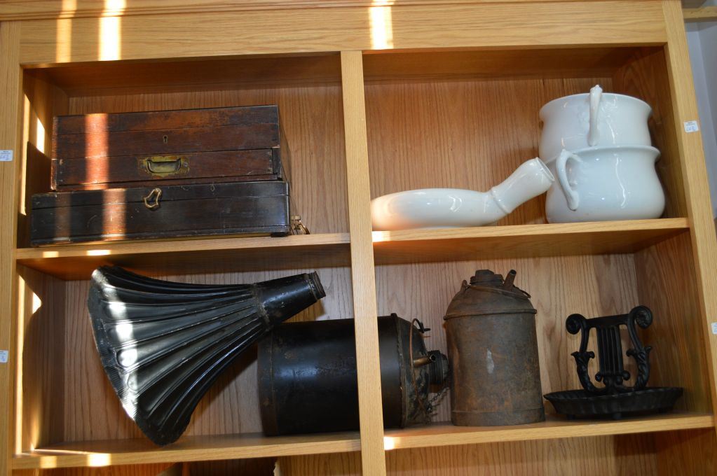 ITEM NOT AVAILABLE FOR SHIPPING. LOCAL BIDDERS ONLY. Two shelf lots of collectibles including two empty flatware chests, speaker horn, gas cans, cast tray, stoneware bed pans and two commodes