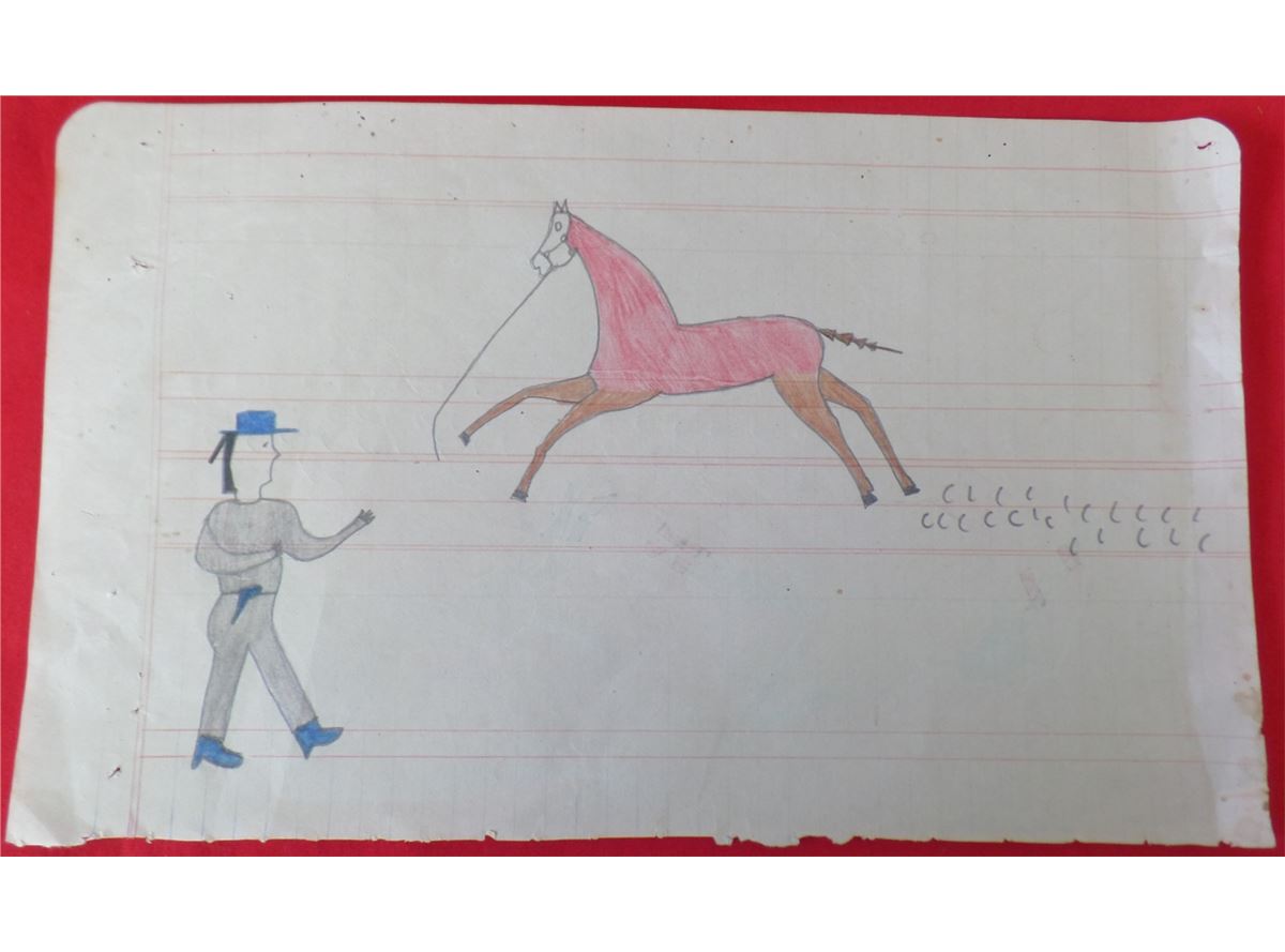 Two sided Ledger drawing depicts man with horse on one side and the other side has two horsed. Condition: Edges are worn with some staining. From South Dakota and the 1880's. Shipping $14.50