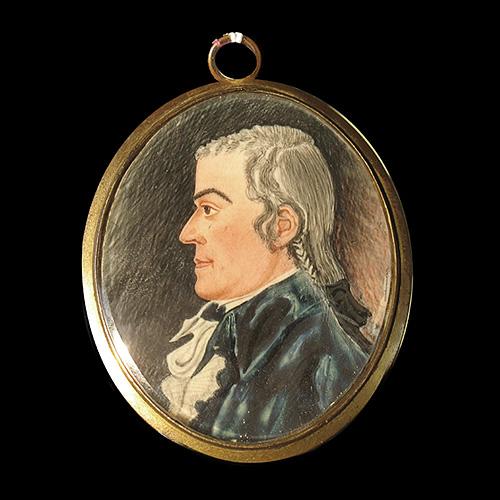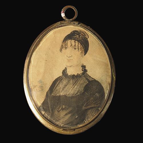 Two-sided miniature portrait painting in beveled glass and brass frame; one side is of a gentleman painted on ivory; the reverse side is of a woman painted on paper; both unsigned; 2 3/4" x 2 1/4" (no visible defects)