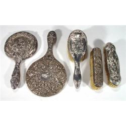 Two silver backed hand mirrors and three brushes, embossed with Art Nouveau style maidens, swags and floral decoration, various dates