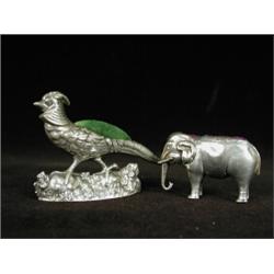 Two silver pin cushions: one in the form of an elephant 1910, 4cm long and one in the form of a golden pheasant 1909 Est. 80/150