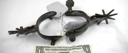 Two similar Mexican Antique Spurs with three inch rowels and heavy engraving. Shipping $20.00 Condition is worn with some rust