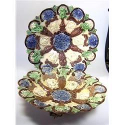 Two similar mask dishes, each rim with brown C-shaped brackets enclosing blue and white flowers, the latter in brown vases separating the variously named cream coloured masks, impressed, incised and sprig marks, one numbered G2 456, 24.5 and 25cm diameter (2) £150-200