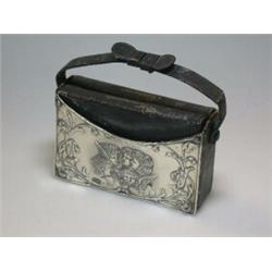 Two small leather bound volumes 'Memoranda' and 'Addresses' contained in a matching slip with adjustable strap handle, silver mounted with a cut rectangular panel by H Matthews & Co, Birmingham 1904, embossed with heads of putti within a scrolled surround, 10cm x 6.25cm £80-100