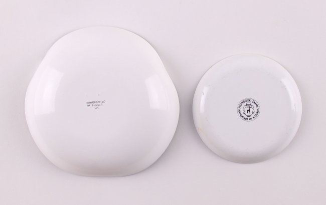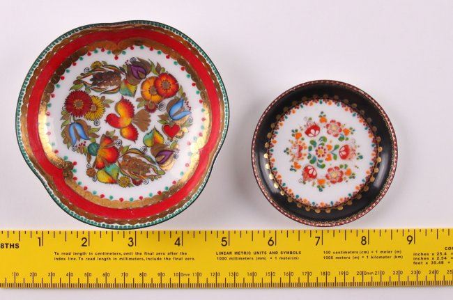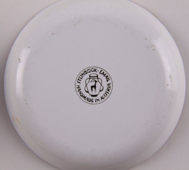 Two small painted Austrian enamel plates. "Hand painted in Austria HM" & "Steinbock Email Handmade in Austria". SIZE: see attached ruler photo. Photos are part of the description representing the condition report and can be used for authentication prior to the sale date. Pangaea Auctions urges Bidder's to view all attached photos in detail. #(European, 19th-20th Century, Bowl, Plate, ).