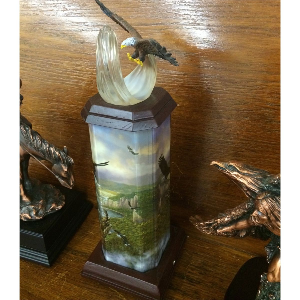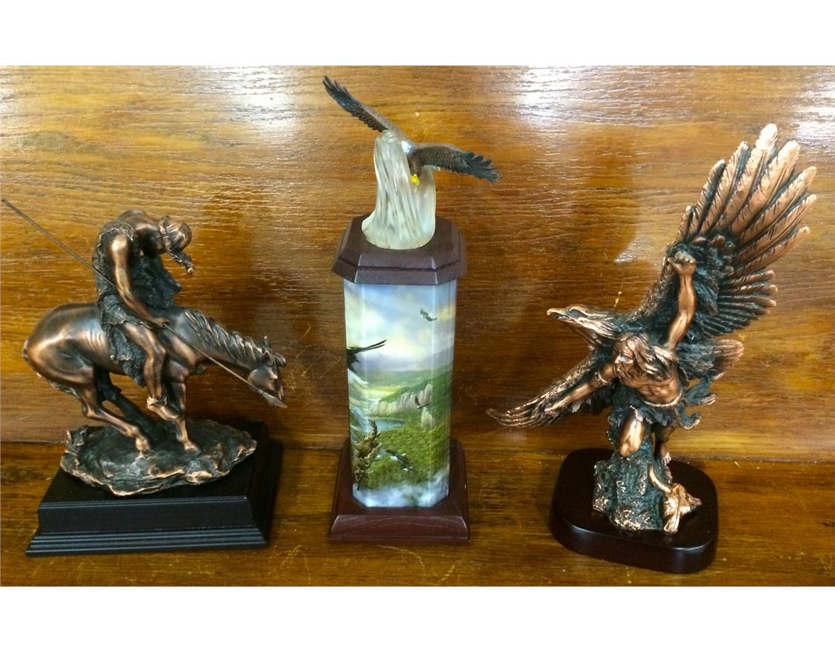 You get three items for one price in this lot! The two statues look like bronze, but are not! The Eagle Light does light up using battery power, but is missing the Electric plug-in. (It will have to run on the batteries unless a power cord is found.)