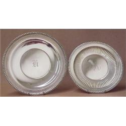 Two sterling silver plates including a 9" plate with gadrooned edge and scalloped banding, initialed in center, impressed J.E. Caldwell with Watson Co maker's mark, 8.4 oz.; and a 10 1/2" plate with gadrooned and pierced rim, monogrammed in center, impressed Bailey Banks & Biddle, Watson Co. maker's mark, 10.4 oz.