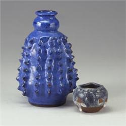 Two stoneware pieces: O. DOUGLASS-HILL bulbous vessel with square opening, 1930s-40s, covered in a thick, dripping blue-gray and white glaze over an unglazed brown ground; and a tapering vessel with prunts covered in a blue flambe glaze (chip to prunt). Both marked. 3" x 4" and 11 3/4" h $200 - 300