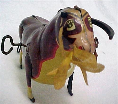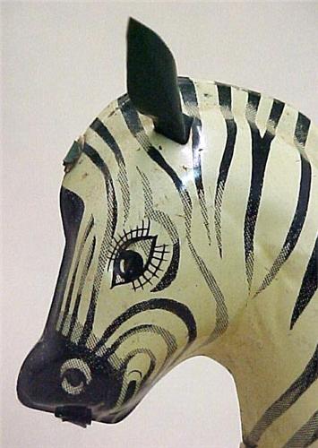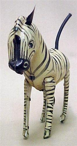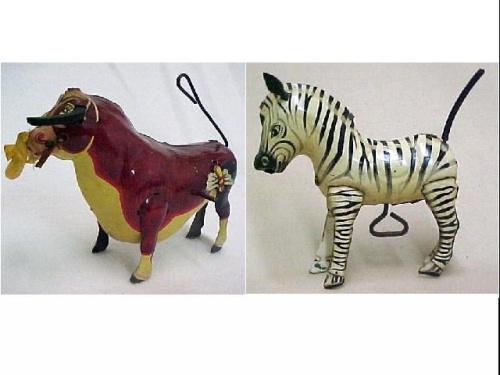 Two tin wind-ups; Ferdinand the Bull; and Zebra with spinning tail; Ferdinand the Bull marked Marx Toys Made in the United States (working condition; 5 1/2 " across 4" high; butterfly on hip present; missing one horn); zebra is unmarked ( 5" across; one e