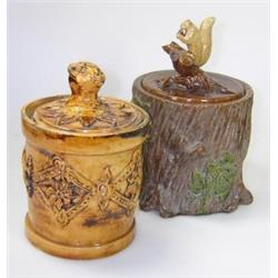 Two tobacco jars and covers, one modelled as a brown tree trunk, a beige squirrel eating a nut forming the cover finial, impressed marks and incised 'G2 1072', 15cm high, the other ochre glazed, shaped like a drum and surmounted by cat's head finial, impressed marks, 13cm high (W) (4) £60-80