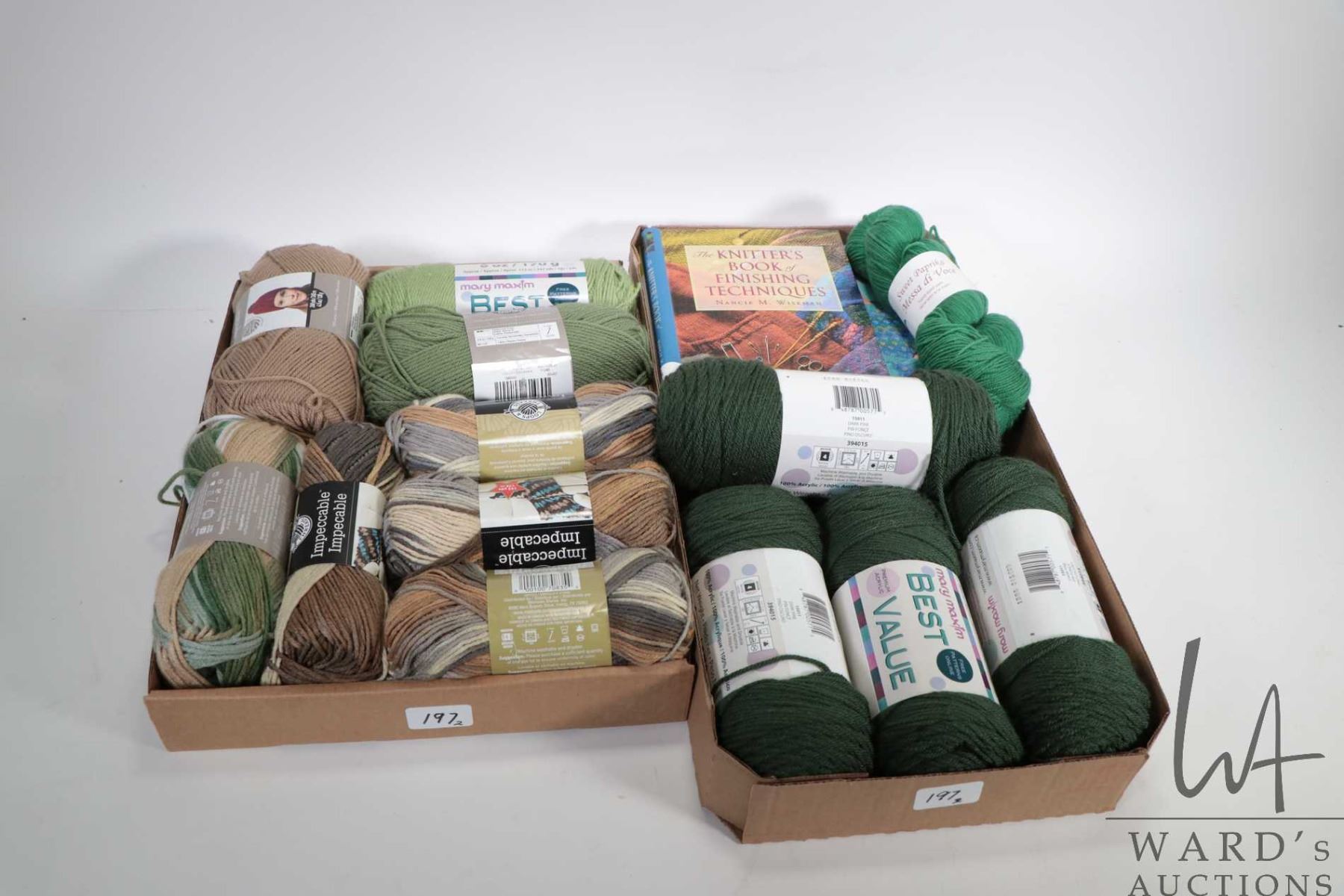 Two tray lots of wool/ yarn including five 100 gram balls of Loops & Threads medium No. 4, two 125 gram balls of Loops & Threads Impeccable medium No. 4, a Mary Maxim medium No. 4, four Mary Maxim 6 oz. balls of medium No. 4 and a 100 gram skein of Sweet Prapika hand-dyed yarn plus four knitting books including " The Knitter's Book of Finishing Techniques", "Knitting Sweaters from the Top-Down", "Cast On, Bind Off" and "Knitting From the Center Out"