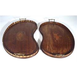 Two twin handled 19th century kidney shaped mahogany gallery trays, with shell and musical instrument inlay, 65cm in length