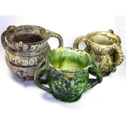 Two tygs and a loving cup, one of the former sprigged 'GRBV 1653', 10cm high, the other 'Remember mee as I doe thee', 11.5cm high (D) and the green strap handled loving cup sprigged with yellow flowers, 9.5cm high (W), various marks (3) £30-40