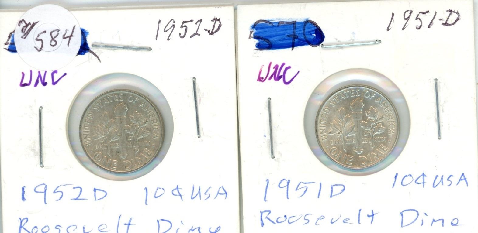 Two unc US 10¢ 1951-D & 1952-D Roosevelt dimes