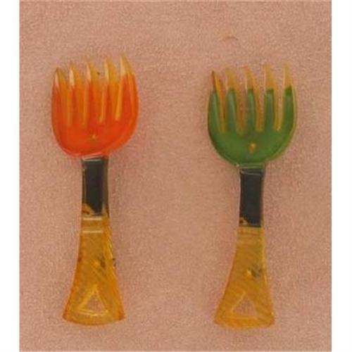 Simichrome tested with "C" clasps! Two cute, unique, adorable Bakelite forks. Unfortunately, I dropped one (the green one) and had to repair the handle of the fork. It was a clean break. For that reason, I'm listing both items for a really reasonable price. Free shipping.