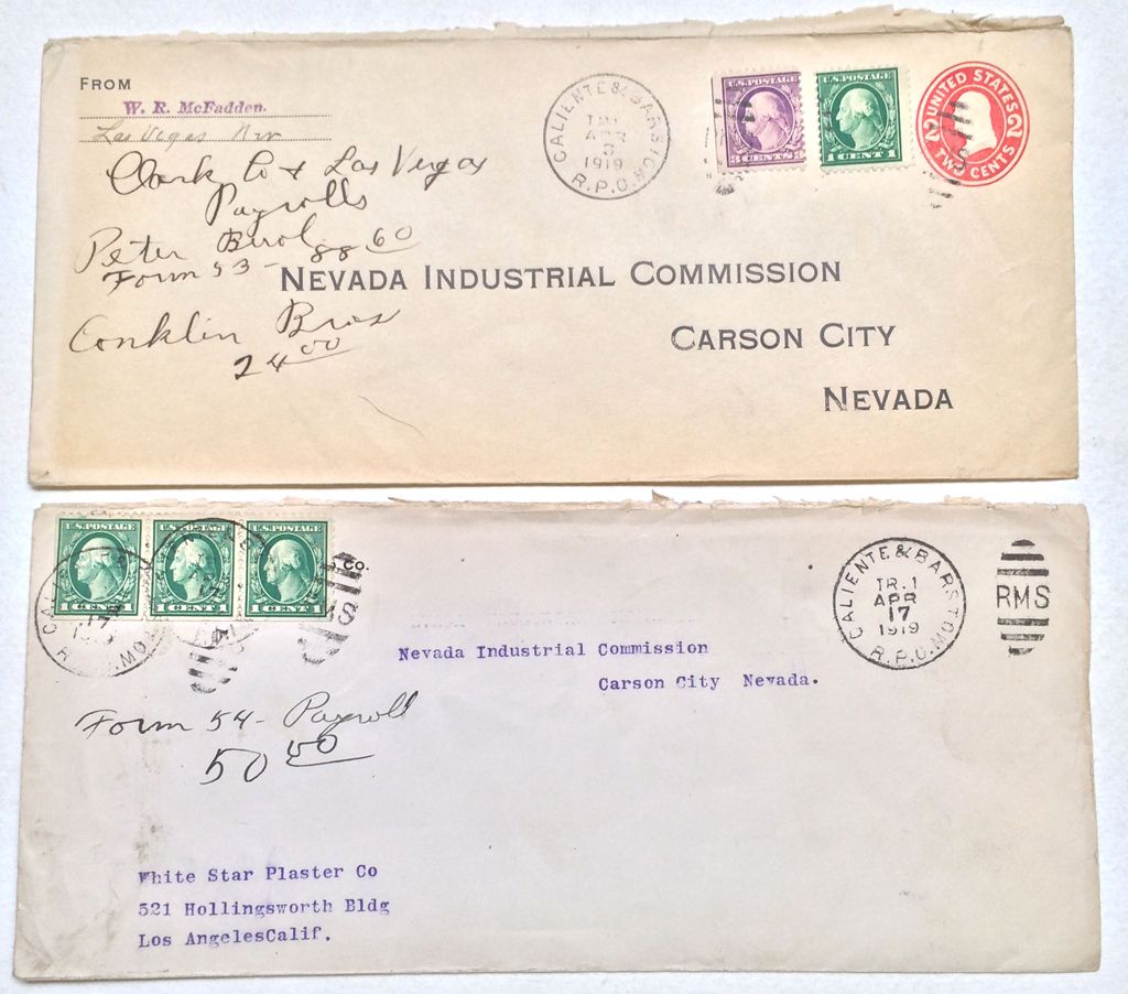 Unlisted in Gamett & Paher Nevada Post Mark Book. One from Conklin Brothers and one from White Star Plaster Company. Both 1919.