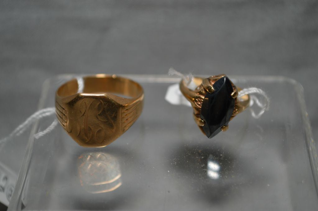 Two unmarked but tested gold rings including 14kt ring set with hematite and 10kt gents ring