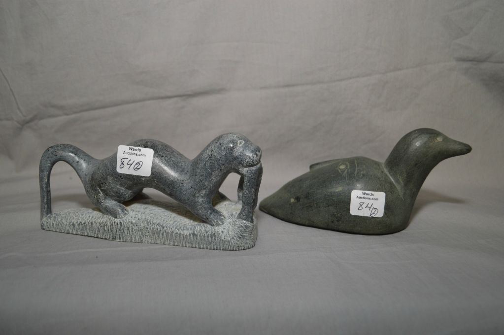 Two vintage carved soapstones including a stylized loon with carved face on back plus a signed otter catching a fish 6 1/2" in length