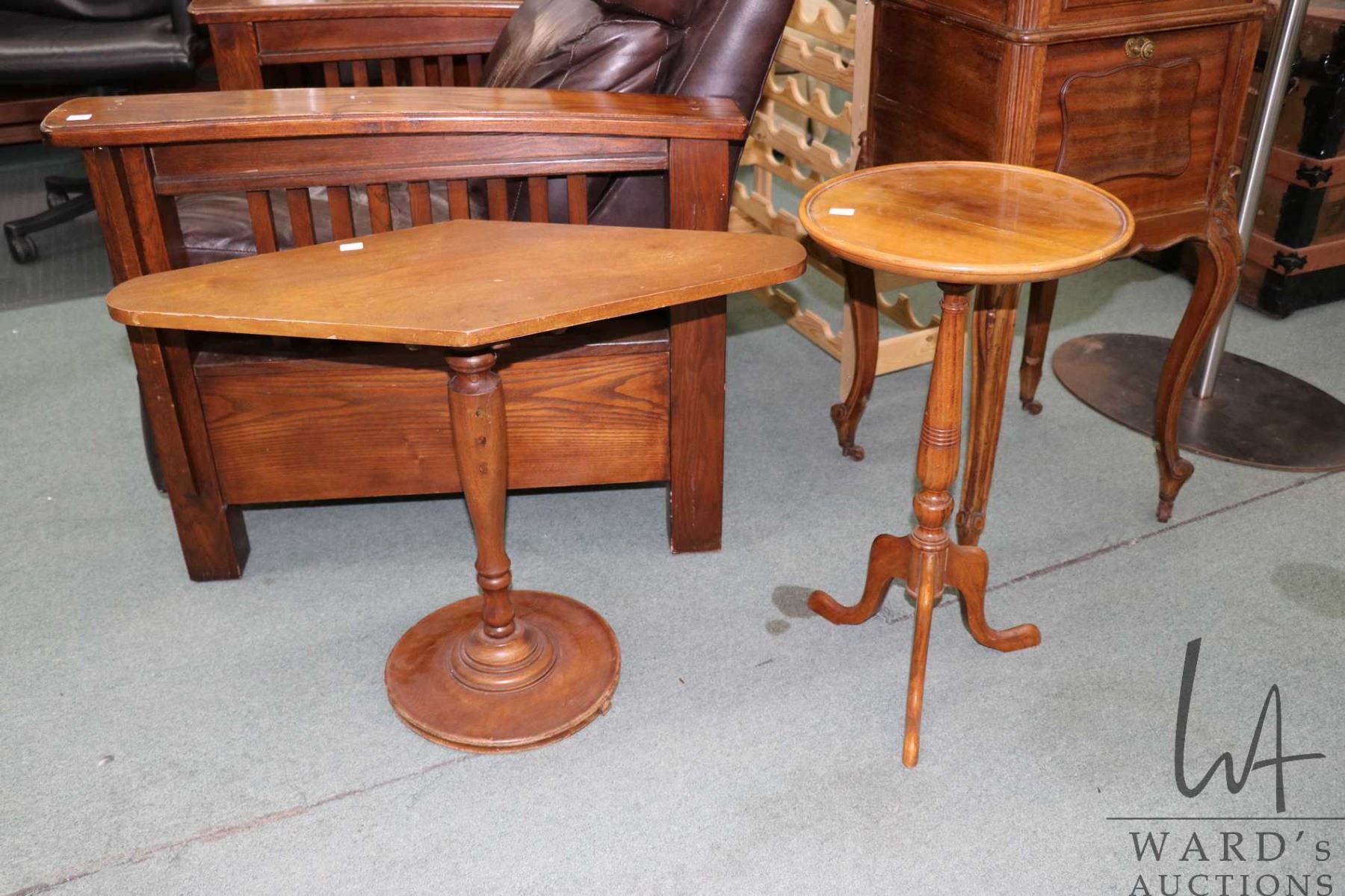 Two vintage center pedestal occasional tables including one 25" H X 13" D and a 22" H diamond shaped