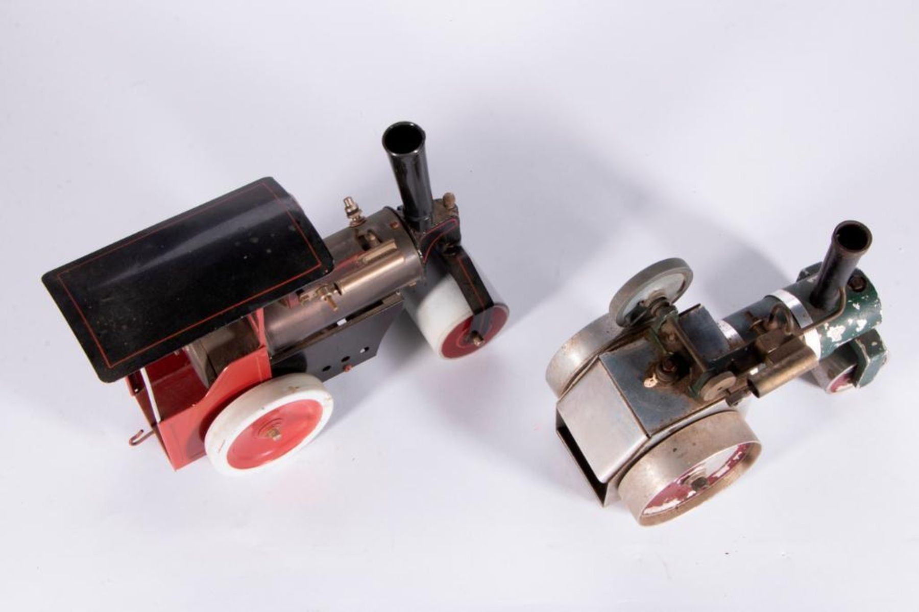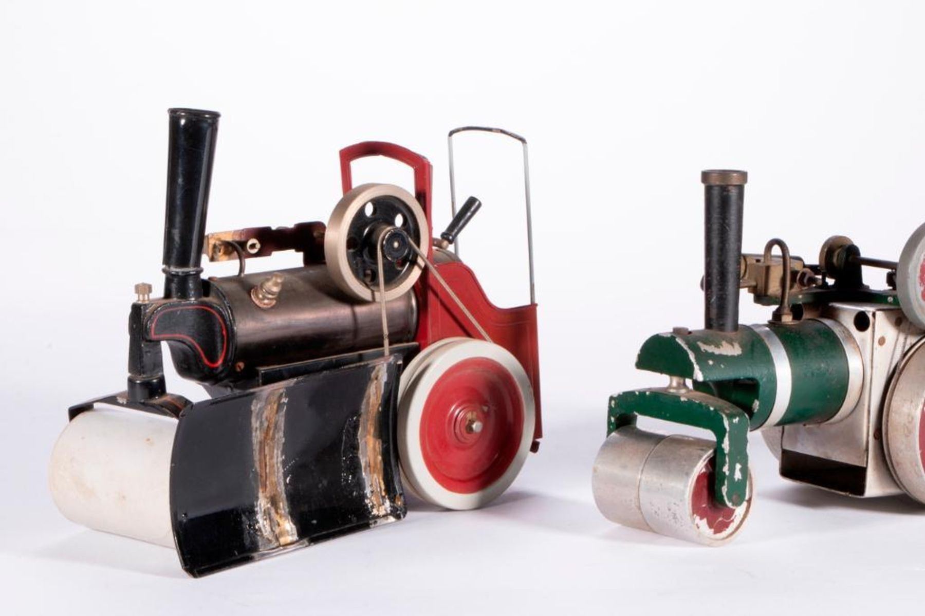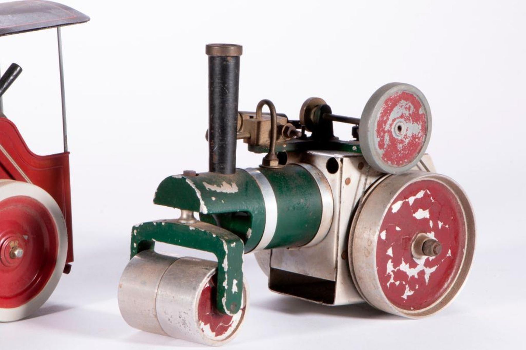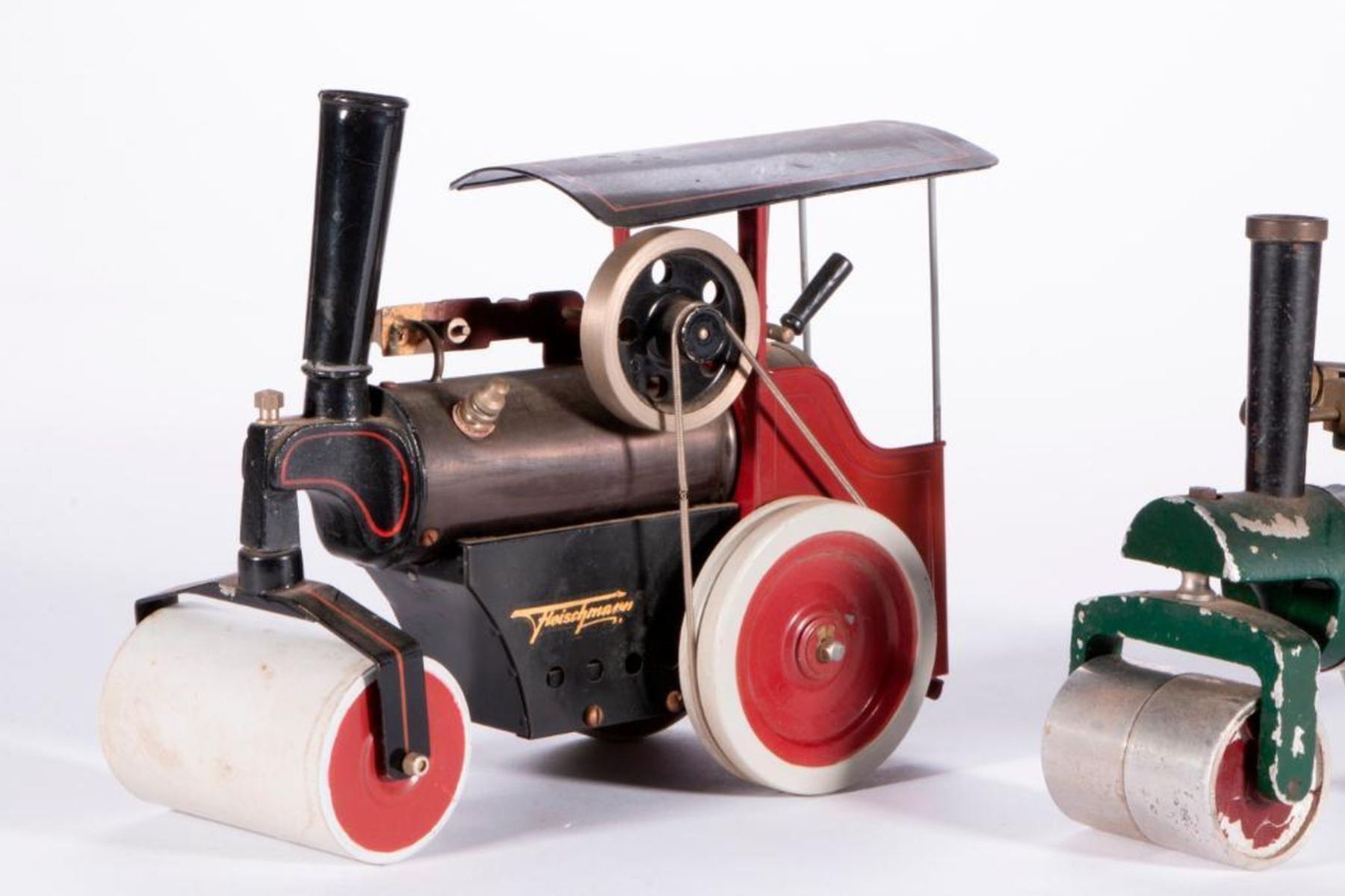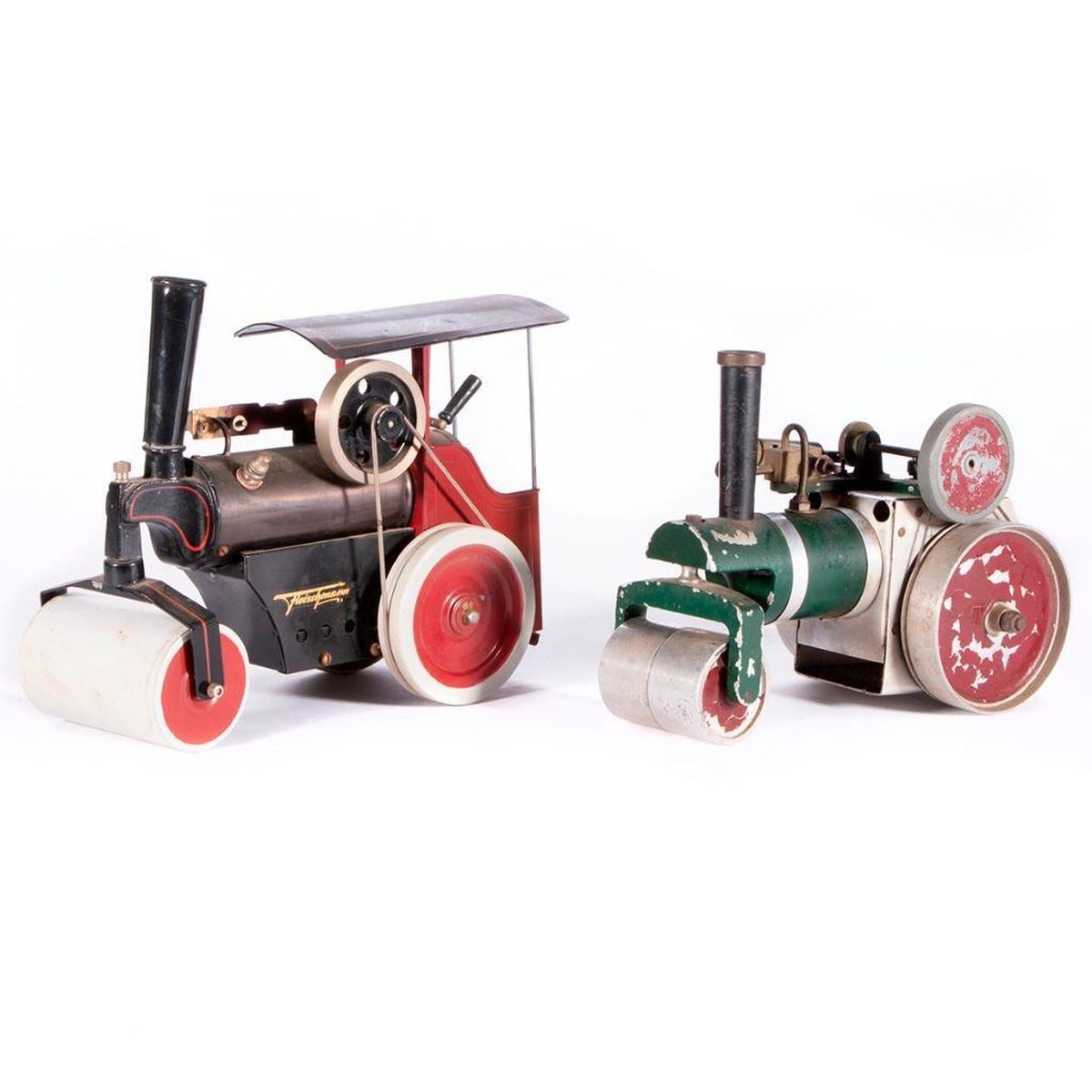 Two vintage German steam roller toys, the larger marked Heischmann. 7 inches high x 9 x 4 and 6 inches high x 7 1/2 x 4. Items are sold as is. Please inquire about condition if not otherwise stated.