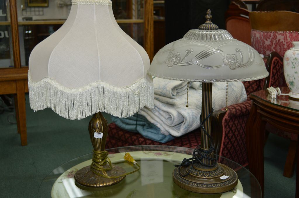 Two vintage style cast table lamps, one with glass shade