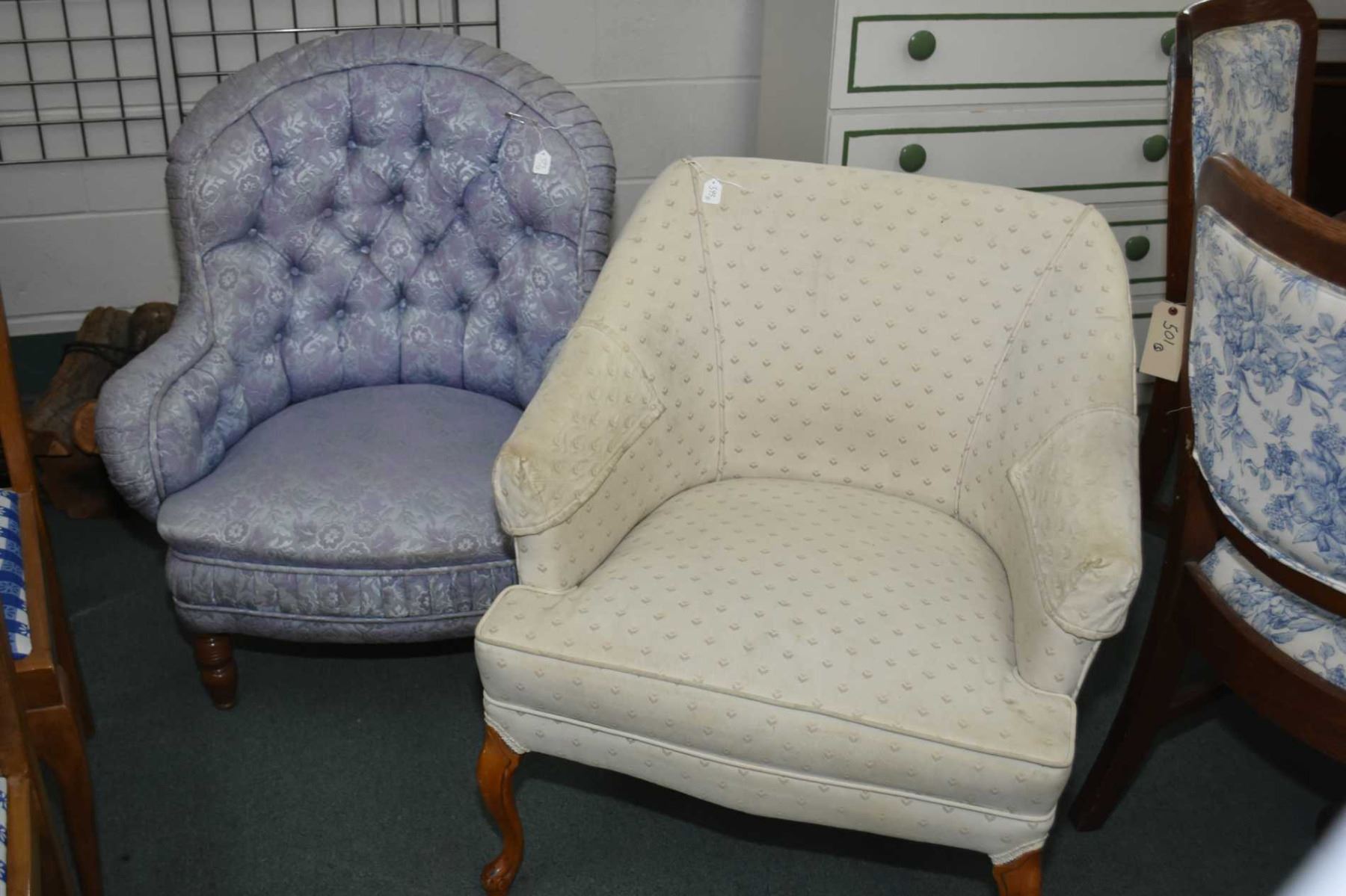 Two vintage upholstered parlour chairs including a violet coloured button tufted slipper chair and a cream tub chair