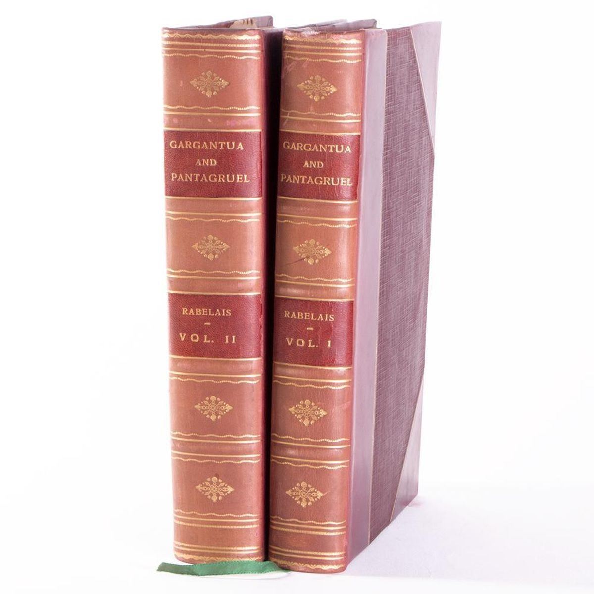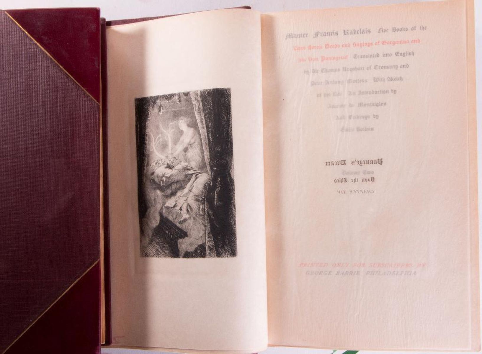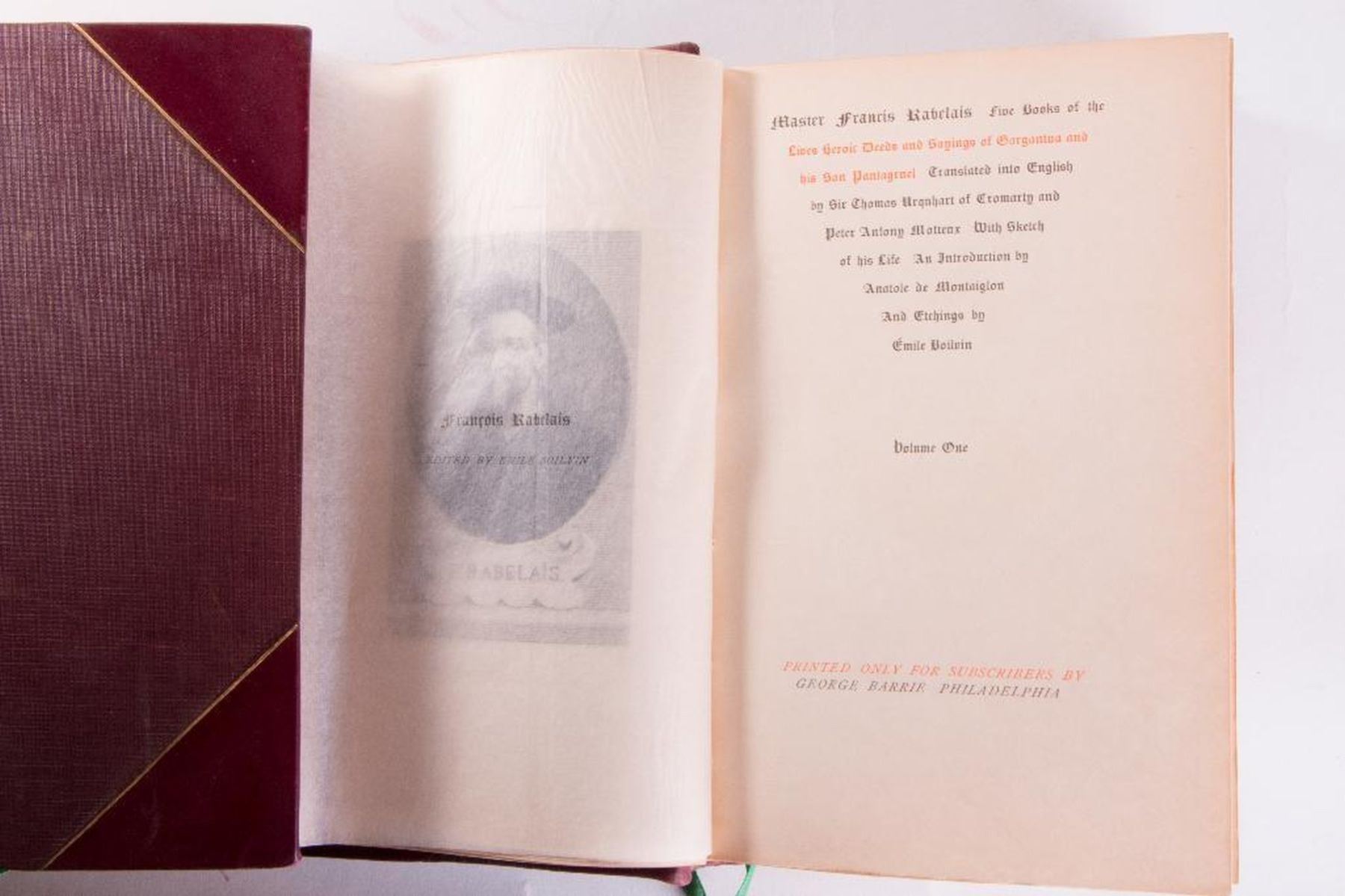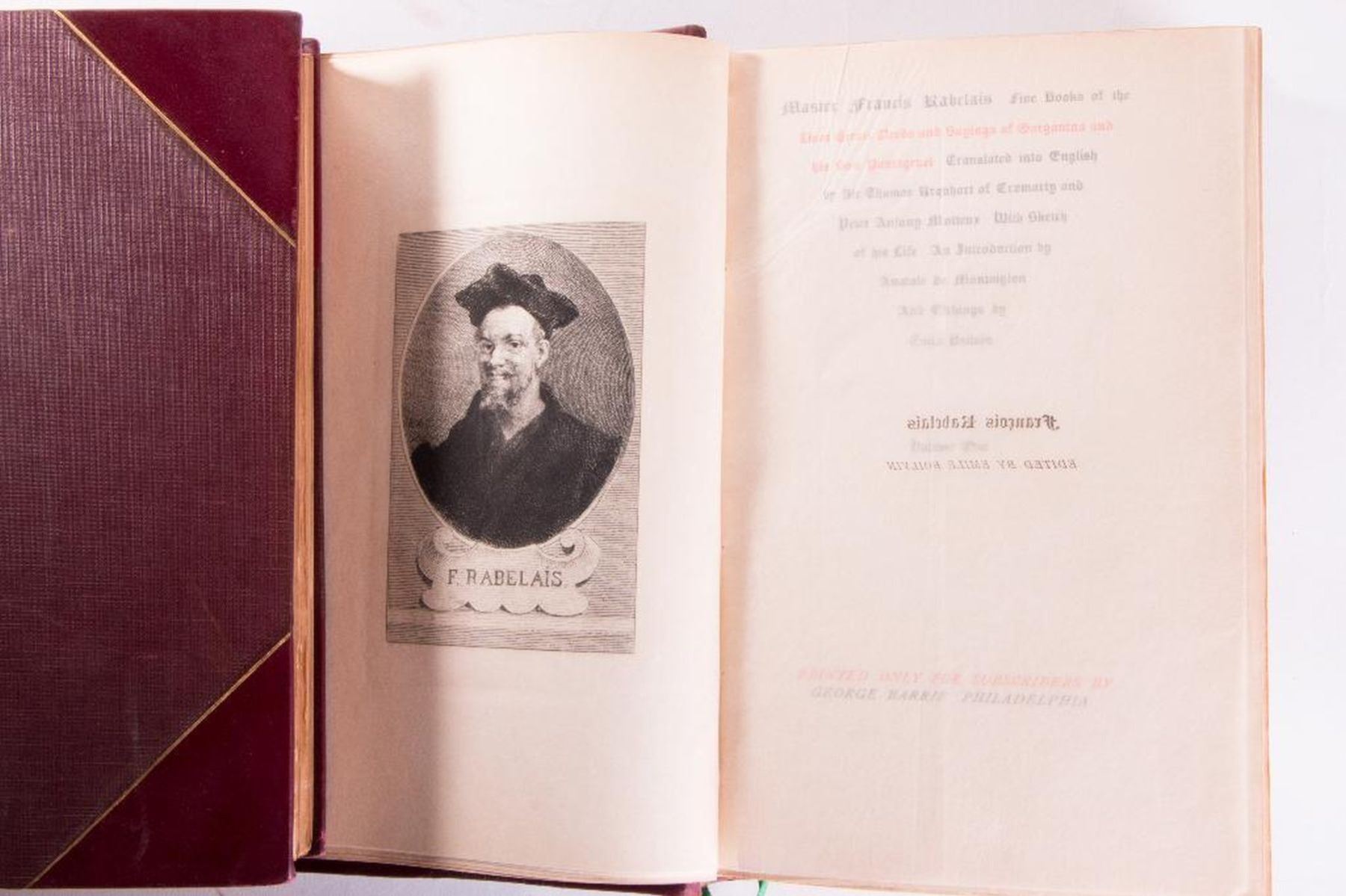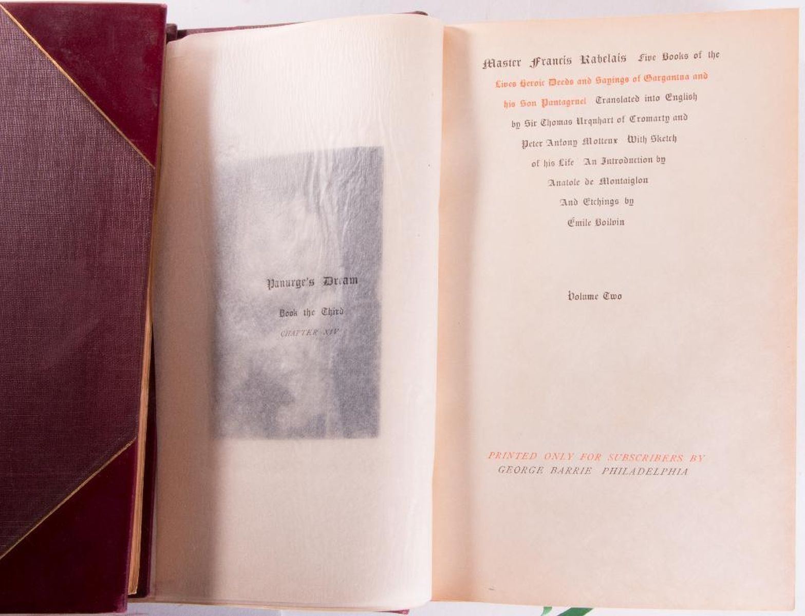 Title: Master Francis Rabelais: Five Books Author: Francis Rabelais Place: Philadelphia Publisher: George Barrie Date: Description: Two volumes printed for subscribers by George Barrie . Introductions by Anatole de Montaiglon. Edited by Emile Boilvin. Illustrations by Emile Bolvin. Bound in half red leather spine with gilt letters. Red leather board edges with gilt. Condition: Very good condition. Rubbing, sunning, chipping, and bumping to spine. Rubbing to front and back boards, bottom and top.