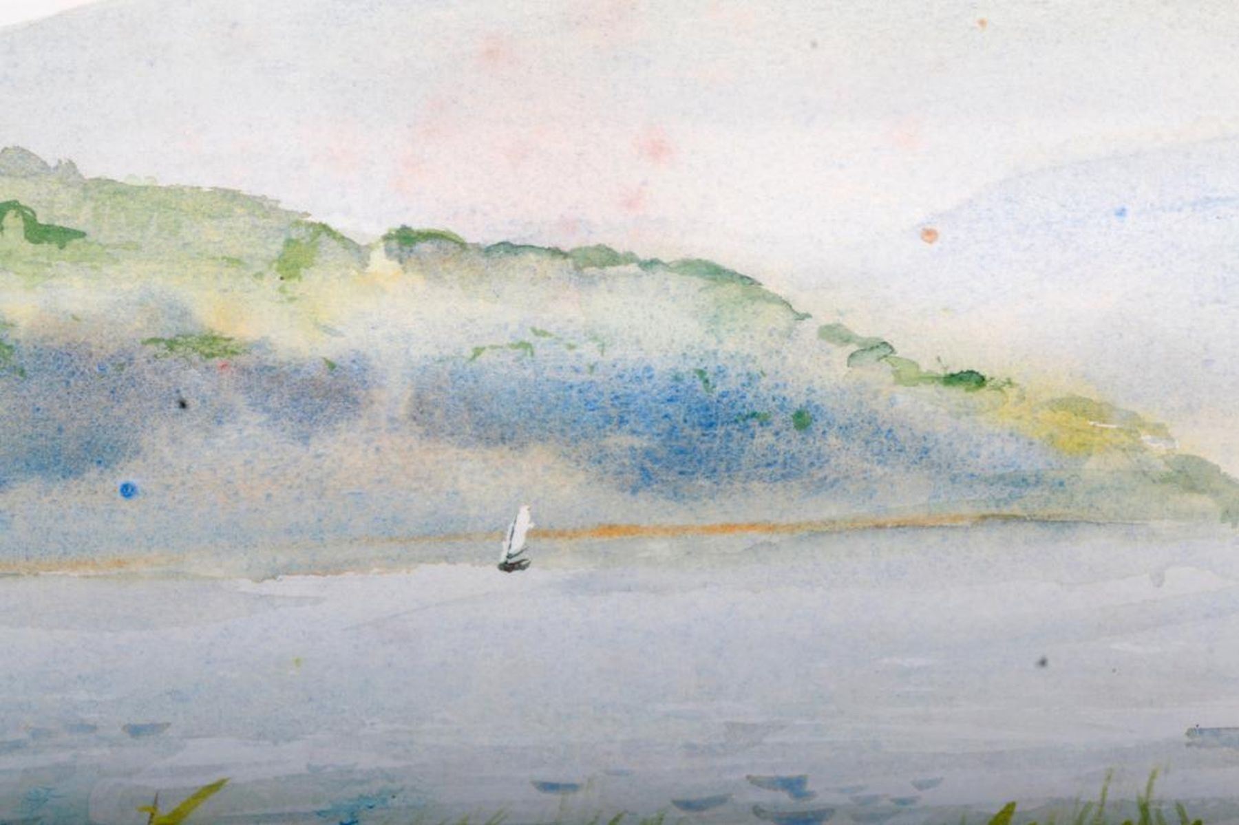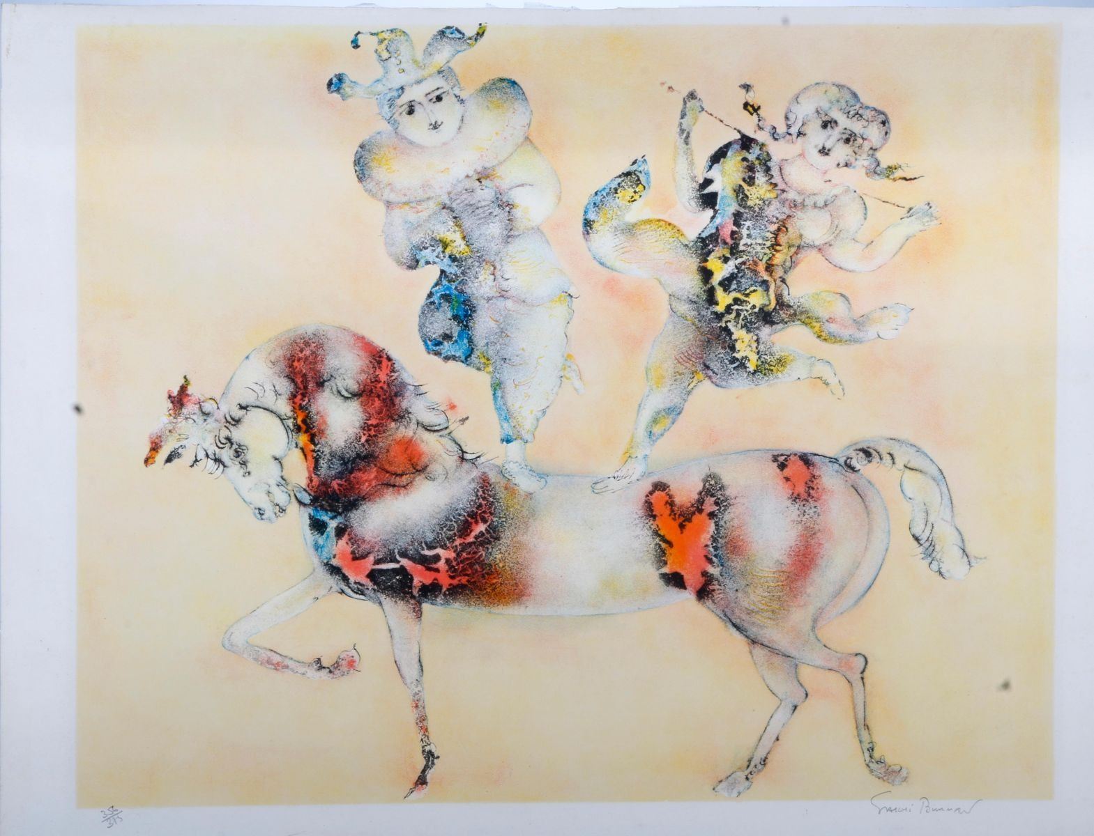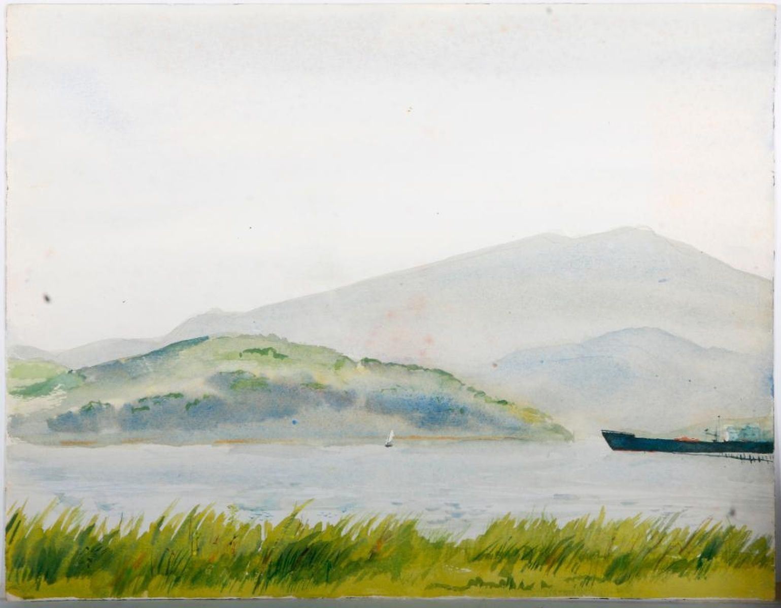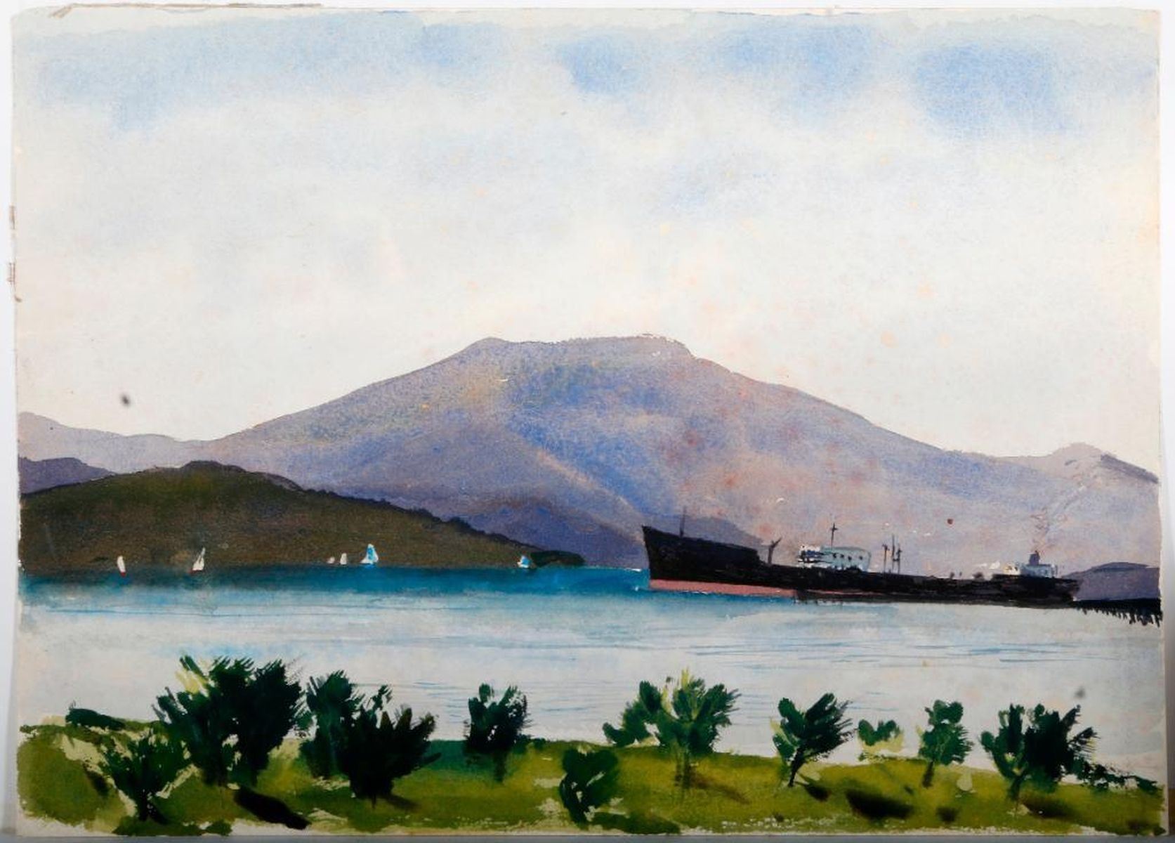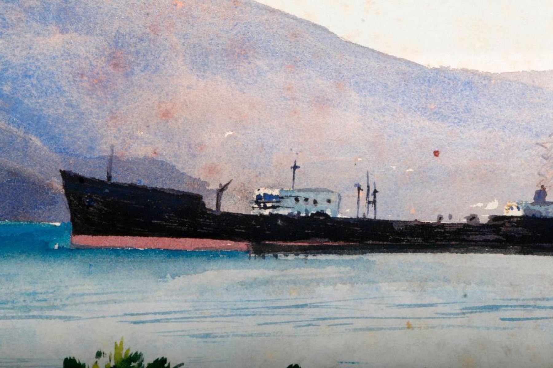 Two 20th century watercolors of tankers and a 20th century lithograph, 356/373, signed Gracie Bunman, litho measuring 18 inches high x 24.