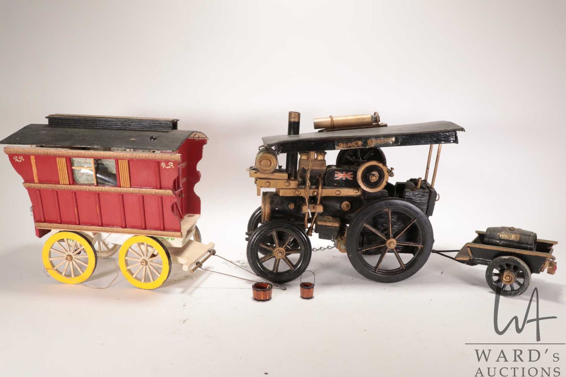 Two wooden models including traveller's caravan and a steam tractor 14" L X 9 1/2" H