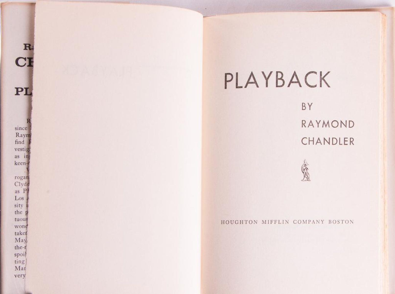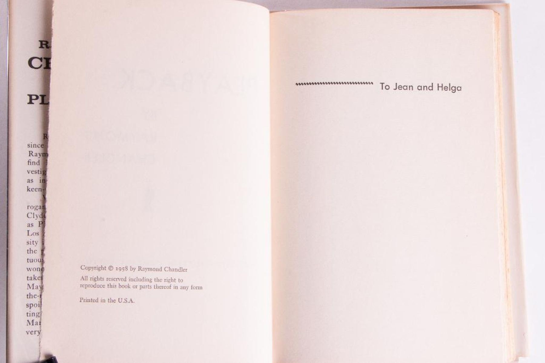 Description: Two works by Raymond Chandler Includes: Title: Playback. Book Club Edition. Published in 1958 by Houghton Mifflin Company, Boston. Hardcover with dust jacket. Very Good condition. Sunning to spine. Title: €œThe Blue Dahlia€: A Screenplay. Published in 1976 by Southern Illinois University Press, Illinois. Ex.library edition. Hardcover bound in blue cloth. Very good edition. Some running of cloth at base of spine.