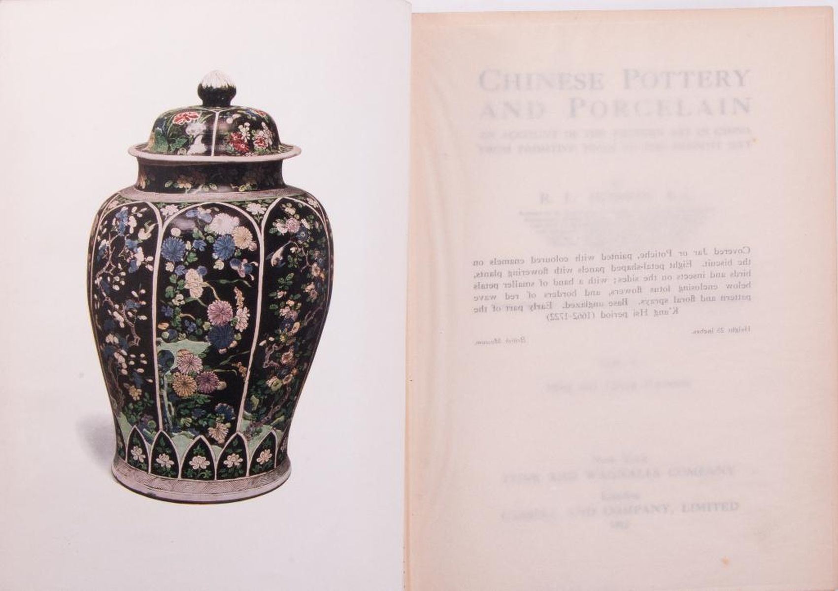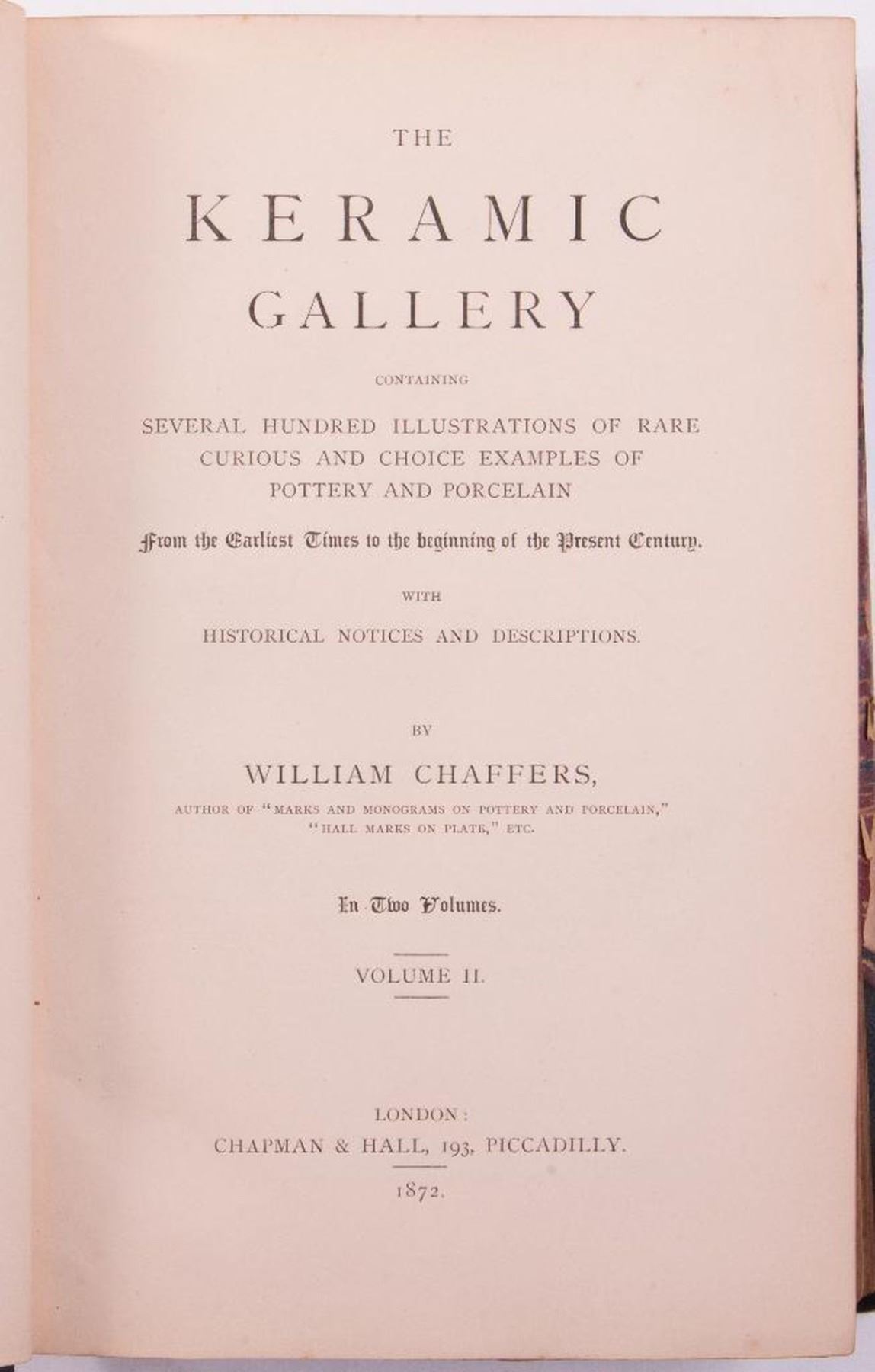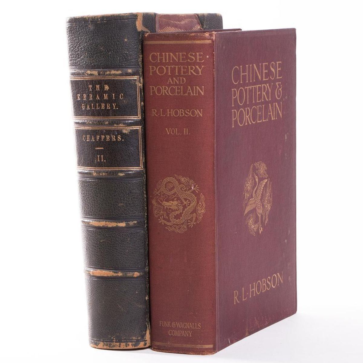 Description: Two works on ceramics, pottery, and porcelain Includes: 1) Title: Chinese Pottery and Porcelain: An Account of the Potter€™s Art in China From Primitive Times to the Present Day by R.L. Hobson, B.A. Published in 1915 by Funk and Wagnalls Company, New York. Volume two: Ming and Ch€™ing Porcelain. Limited edition of 1500 of which this is 1336. First edition. Forty plates in color and ninety-six in black and white. Bound in red cloth with gilt lettering and design. 2) Title: The Keramic Gallery: Containing Several Hundred Illustrations of Rare Curious and Choice Examples of Pottery and Porcelain by William Chaffers. Published in 1872 by Chapman & Hall, London. Volume two. Bound in green leather and marbled boards. Five raised bands with gilt letters. Condition: Good condition. Slight foxing to endpapers. Sunning and bumping to spine. Rubbing of cloth and marks on front and back cloth boards.