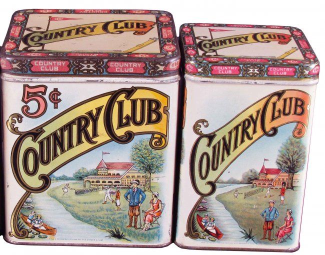 Two Country Club Cigar Tins. One 50 count and one 25 count. Beautiful color and graphics, The Liberty Can Co. Lancaster, PA. Overall excellent condition.