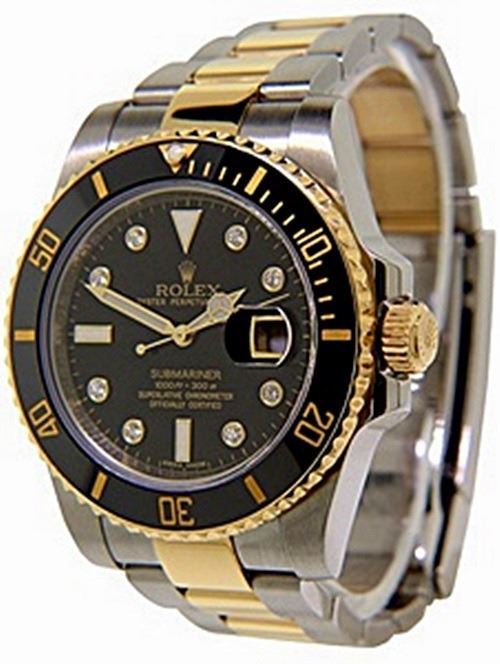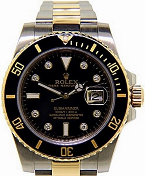 Manufacturer: Rolex , Model Name: Submariner , Model Number: 116613 , Gender: Mens , Circa 2008-2009 , Condition: Pre-Owned Polished and Overhauled, Case: Stainless Steel 40mm Width , Movement: Automatic , Dial: All Original Rolex Face with Diamonds , Bezel: Rotable Stainless Steel with Black Insert and Golden Details, Crown: 18K Yellow Gold , Bracelet/Strap: Stainless Steel & 18K Yellow Gold Oyster Fits up to 7 3/4 Inches , Crystal: Sapphire , Calander: Quick-Set Date at Three O'Clock, Box/Papers: Box and Papers Included