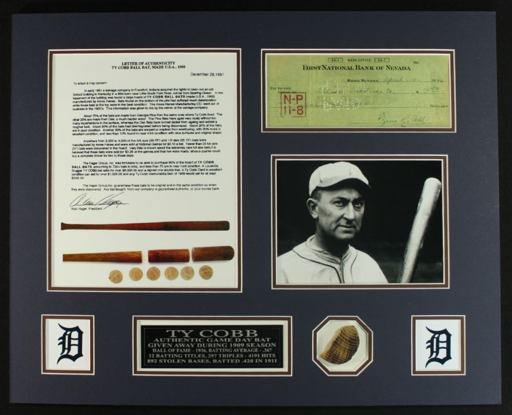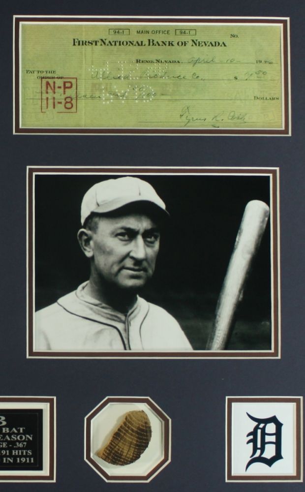 Custom matted piece which is highlighted by a generous 2x2 section of authentic vintage model Ty Cobb baseball bat. The signed check is a copy of an original for presentation purposes. The bat piece includes a LOA for authenticity purposes.