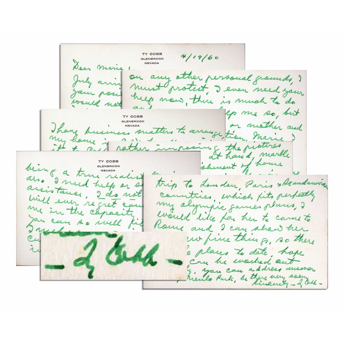 Ty Cobb autograph letter signed on four of his personal note cards (front and verso). Cobb writes in April 1960 to his future helper-cum-companion Marie Quinn: ''...I would not for the world put my interests ahead of a parental physical condition, but if you should...wait into July before coming here on any other personal grounds, I must protest...'' Cobb then writes of his trip to see the Olympics, business matters, his will and a mausoleum. Signed ''Ty Cobb'' with ''Cobb'' also written once in letter. 5.25'' x 3.25''. Very good, with envelope.