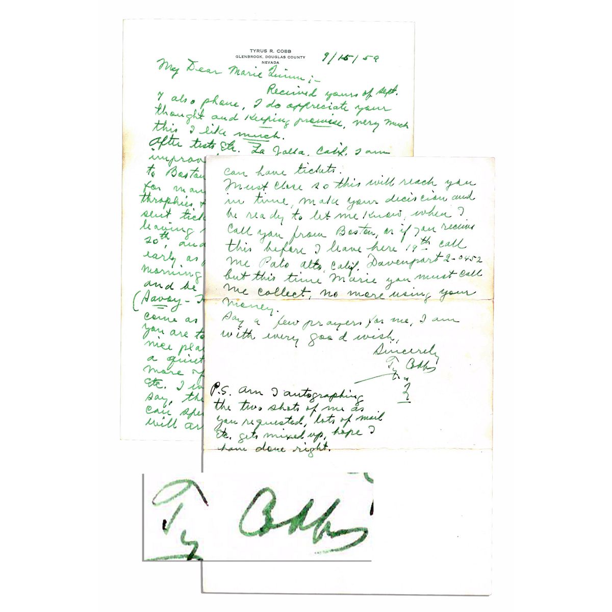 Ty Cobb autograph letter signed to Marie Quinn, dated 15 September 1959: ''...let me take you to a real nice place for dinner so we can...learn a little more of each other, ideals, principals [sic]...It is so refreshing to know and see a girl, carrying out your activities...jobs etc...when I see you we can discuss World Series to come...They really have a baseball race out here...No matter who wins I can get tickets...Ty Cobb'' and then again ''Ty''. 5pp. letter on 3 sheets of his stationery measuring 7.25'' x 10.5''. Very good condition, with envelope.