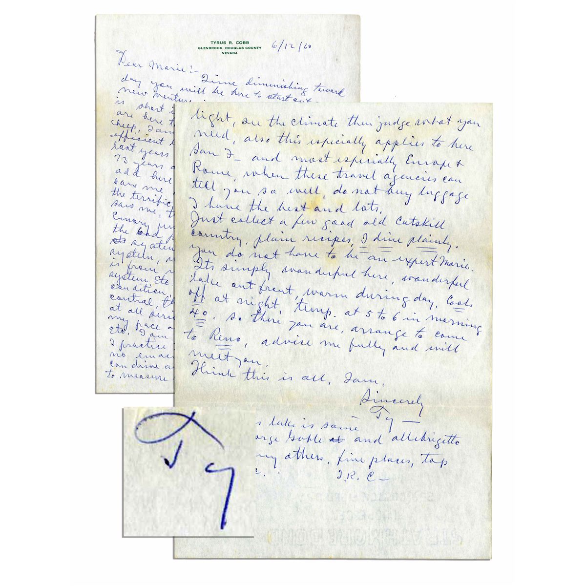 Ty Cobb autograph letter signed ''Ty'' and ''T.R.C.'' to Marie Quinn. Dated 12 June 1960 on 4pp., Cobb writes, ''...I am determined to start a new and efficient life...I want [my granddaughter] to join me in Rome for some of Olympics. There is where you come in...chaperone and show her...I only want your absolute loyalty to me in helping and to be counted on to stay...Marie should you meet someone you can be interested in, you are to use my house freely as if a daughter to receive them...'' 7.25'' x 10.5'' sheets with first on his letterhead. Very good.