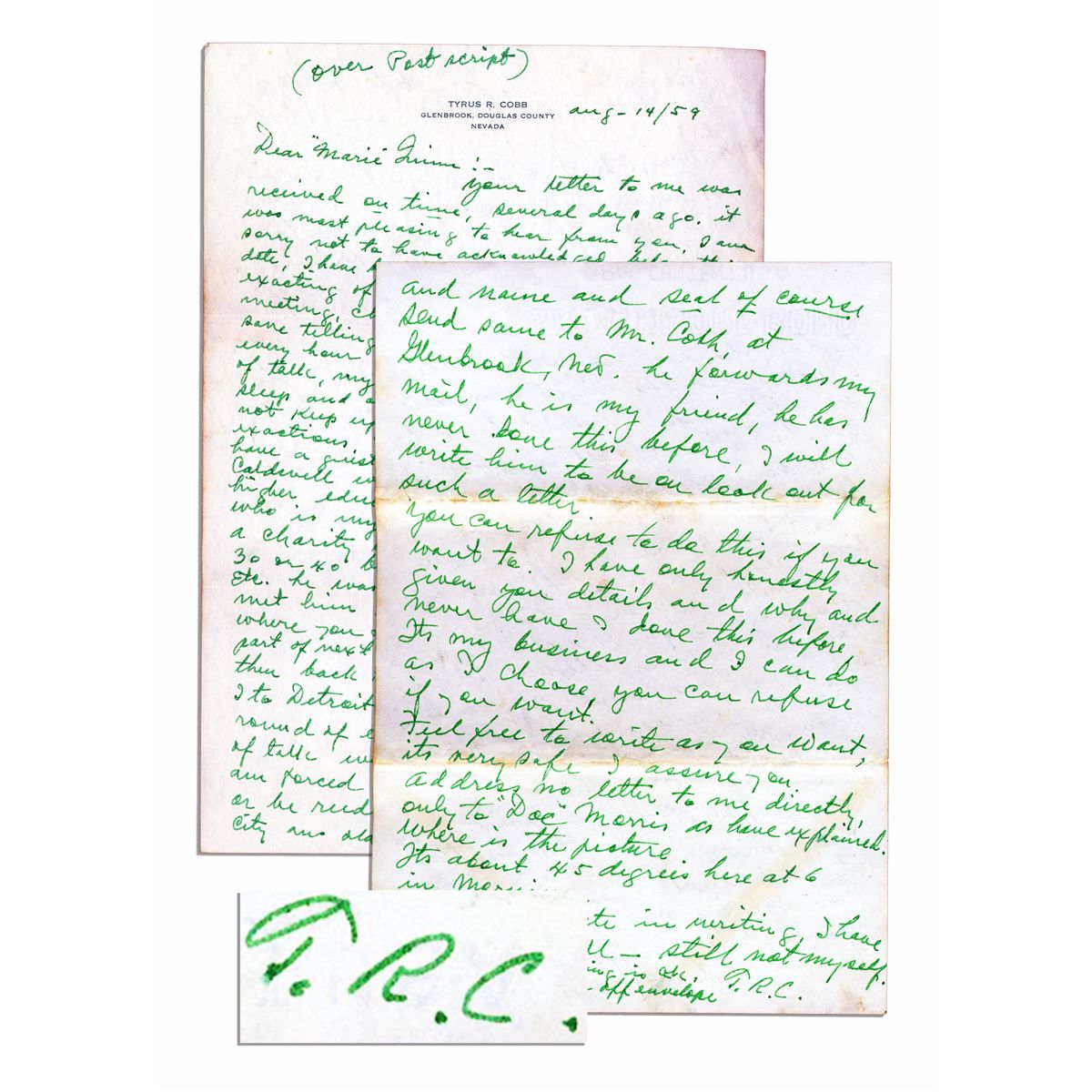 Long autograph letter signed ''T.R.C.'' by the legendary outfielder, writing of baseball, his ''brannigan'' housekeeper and his hectic schedule. To Marie Quinn dated August 1959, ''…to the ball park for events, meeting many and forced conversations…During the ball game honoring Zach Wheat…had to leave the box there with some 12 Hall of Famers…Joe Cronin Pres. of American league calls says he has a ticket for all star game in Los Angeles and wants me to come…I need some real sympathy and comfort…'' 7.25'' x 10.25'' with envelope. Very good.