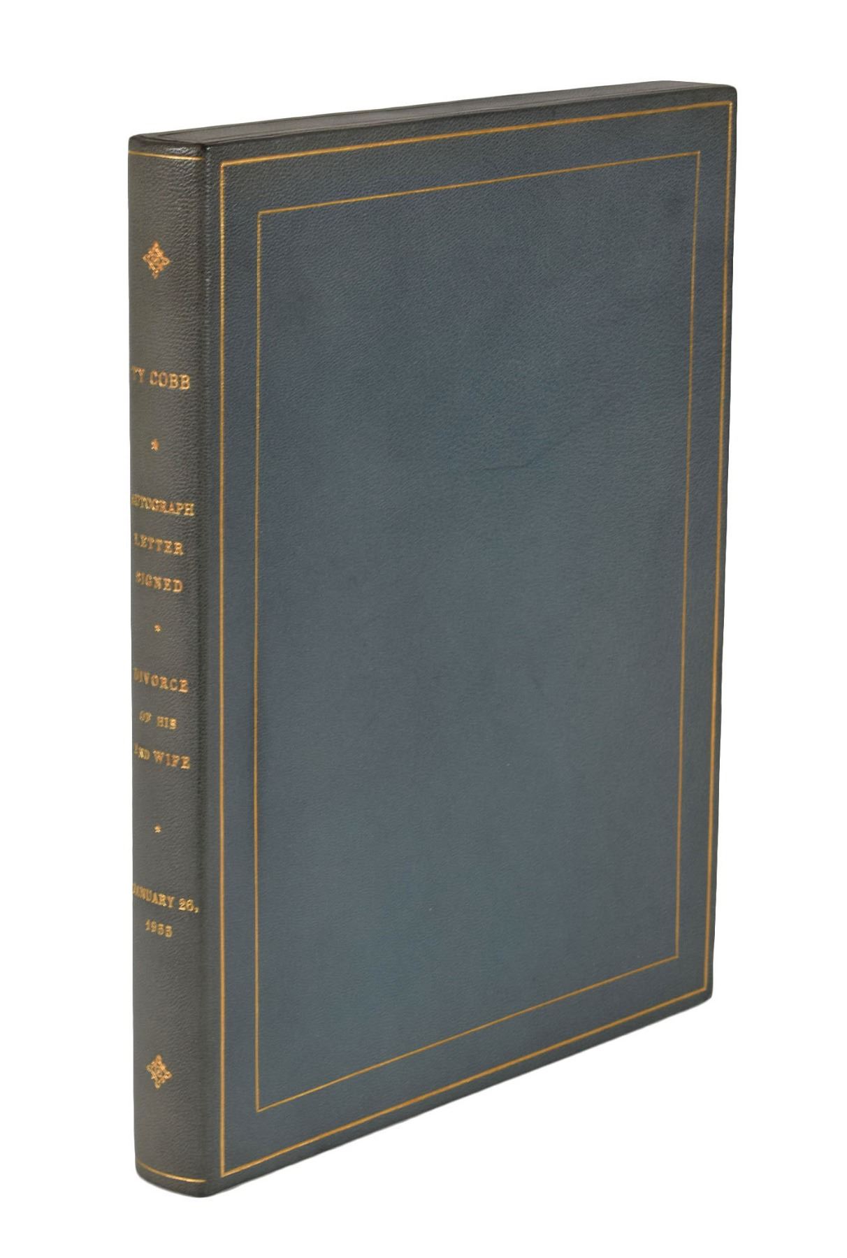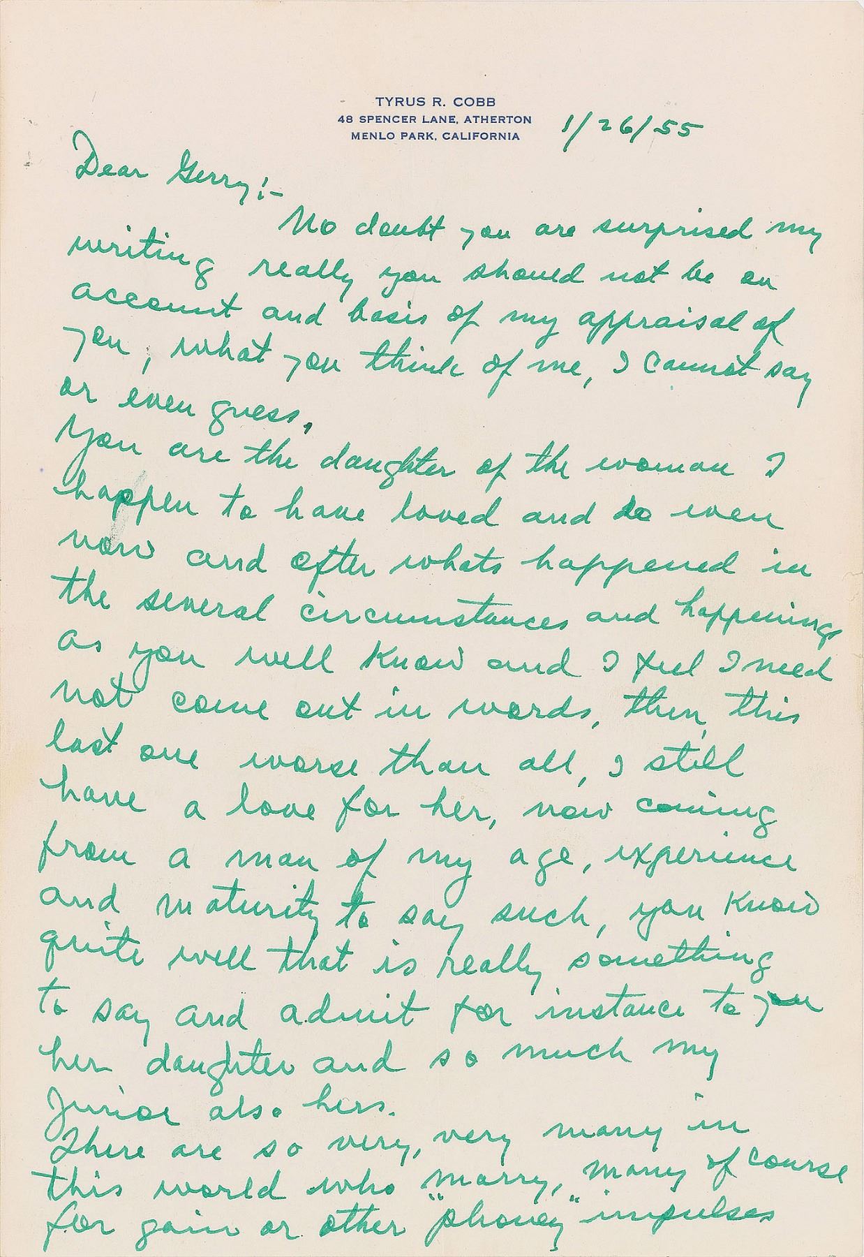 After Cobb discusses his relationship with her mother, mentioning their avoidance of the courts and offering his thoughts on the reasoning behind her behavior, he concludes the letter: “So Gerry here it is for you only her daughter one that I have learned to think much of. The letter is long, no doubt the longest letter, even taking in Hoover that you have ever received. Well at least I hold that record with this your longest letter—ha! ha! If you should have impulse to write me about my desire and outpourings in this as I felt you her daughter should know all that happened and then you would not be thinking of things, influences etc. that did not happen and with me could never happen in my treatment of your mother, my wife. For proof of my honesty of all this also sincerity I give you my permission to send this letter to your mother. If you should not want to do this then I do ask that you destroy it at any time you elect after reading and rereading to your satisfaction.” Cobb pens a pair of lengthy postscripts, signing with his initials, “T. R. C.,” at the end of the first. The letter is housed in a handsome custom-made folder with leather-bound slipcase. In fine condition. Accompanied by the original mailing envelope addressed by Cobb, who incorporates his signature into the return address field: “T. R. Cobb, Menlo Park, Calif.”