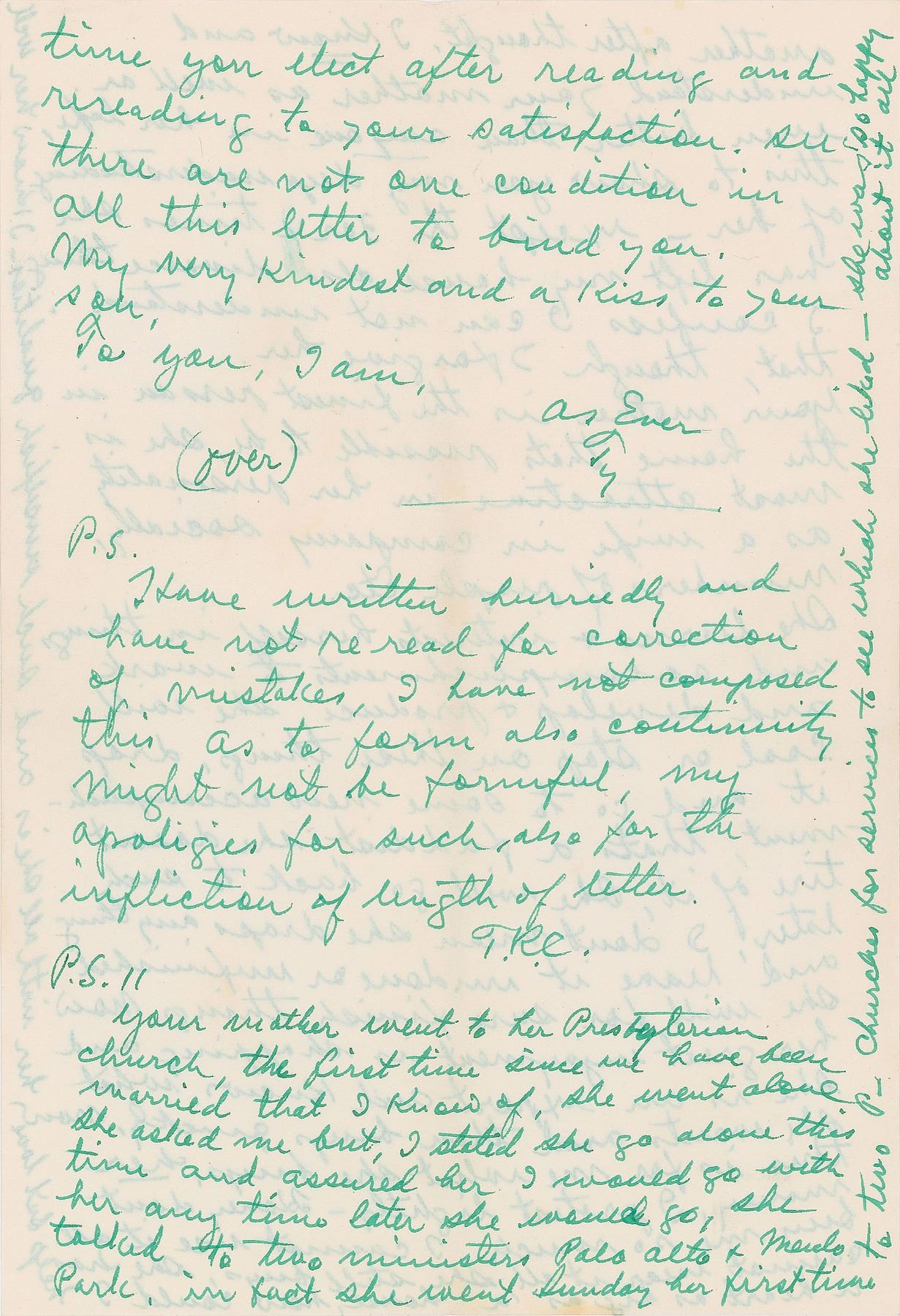 ALS signed “Ty,” 26 pages, 7.25 x 10.5, personal letterhead, January 26, 1955. Lengthy letter written to his stepdaughter, Gerry, in part (grammar and spelling retained): “No doubt you are surprised my writing really should not be on account and basis of my appraisal of you, what you think of me, I cannot say or even guess. You are the daughter of the woman I happen to have loved and do even now and often what’s happened in the several circumstances and happening as you will know and I feel I need not come out in words, then this last one worse than all, I still have a love for her, now coming from a man of my age, experience and maturity to say such, you know quite well that is really something to say and admit for instance to you her daughter and so much my junior also hers.