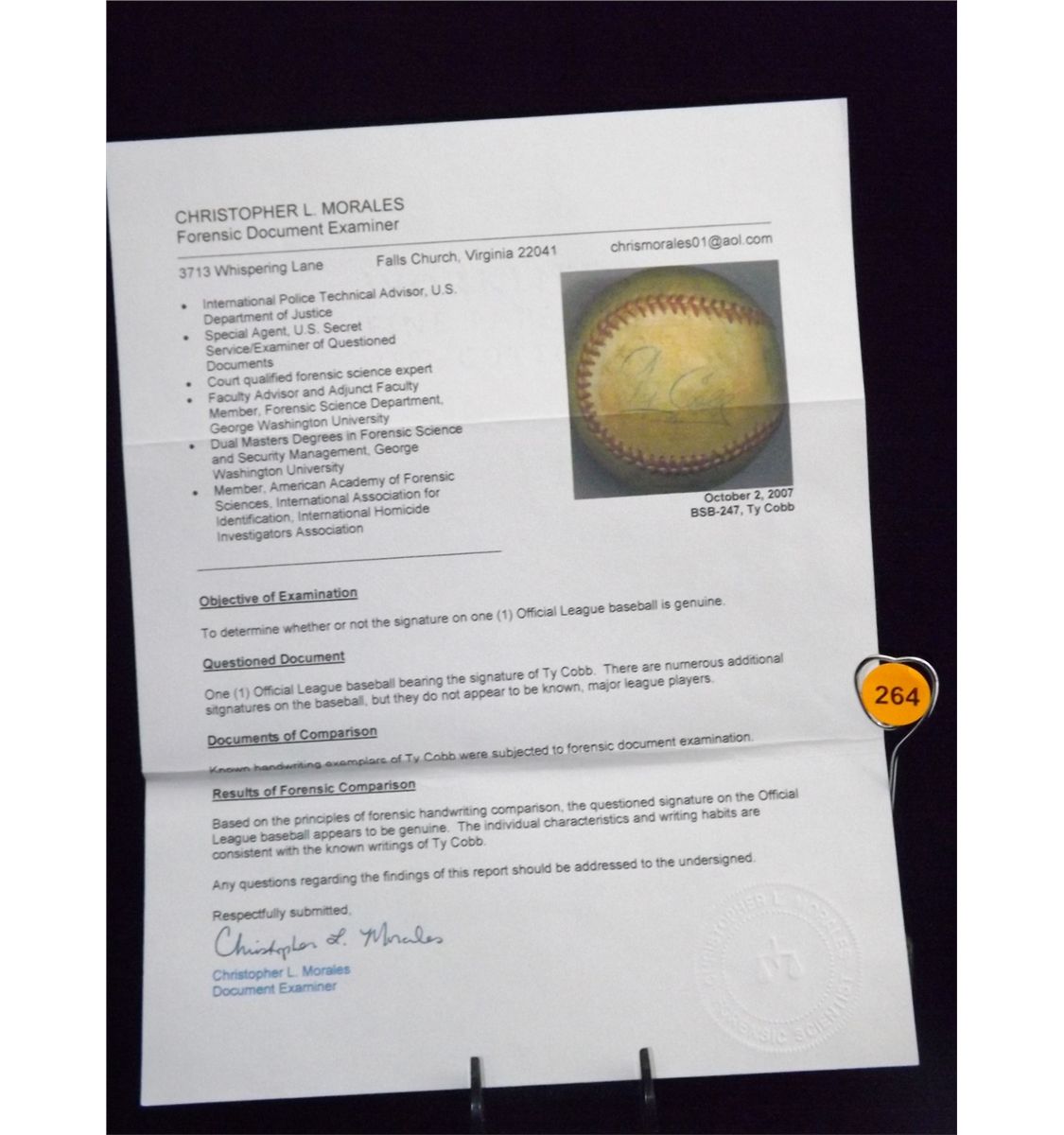 Ty Cobb Autographed Baseball. Unknown Ball. Numerous autographs in addition to Cobb. (Only Cobb is verified) Appraised or estimated retail value $6000. COA by Christopher Morales. All Sales Final. Please see terms and conditions of auction.