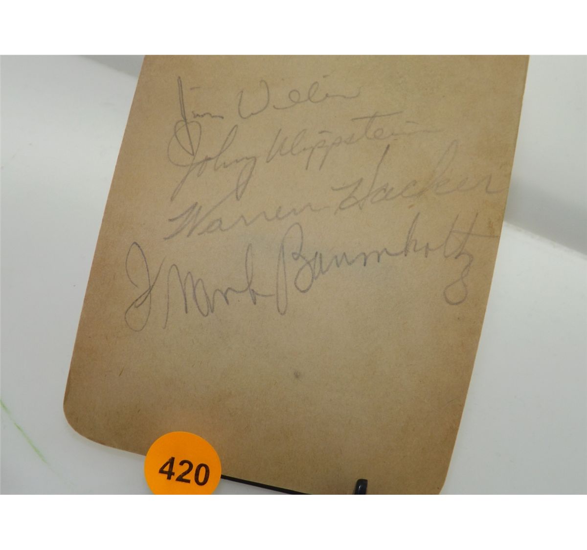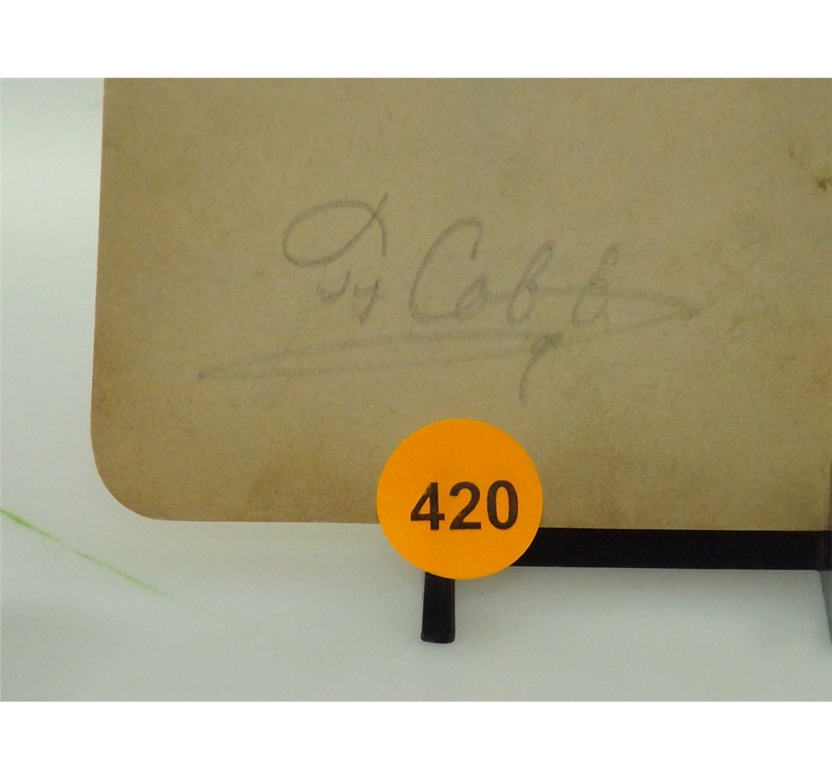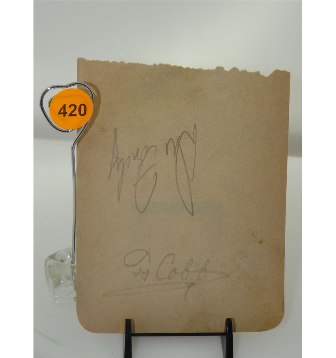 Ty Cobb Autographed Book Page. 5 Other Unknown Signatures on Page (1 next to Cobb and 4 Others on Back). Appraised or estimated retail value $1500. COA for Ty Cobb Autograph by Christopher Morales (No COAs on Other Signatures). All Sales Final. Please see terms and conditions of auction.